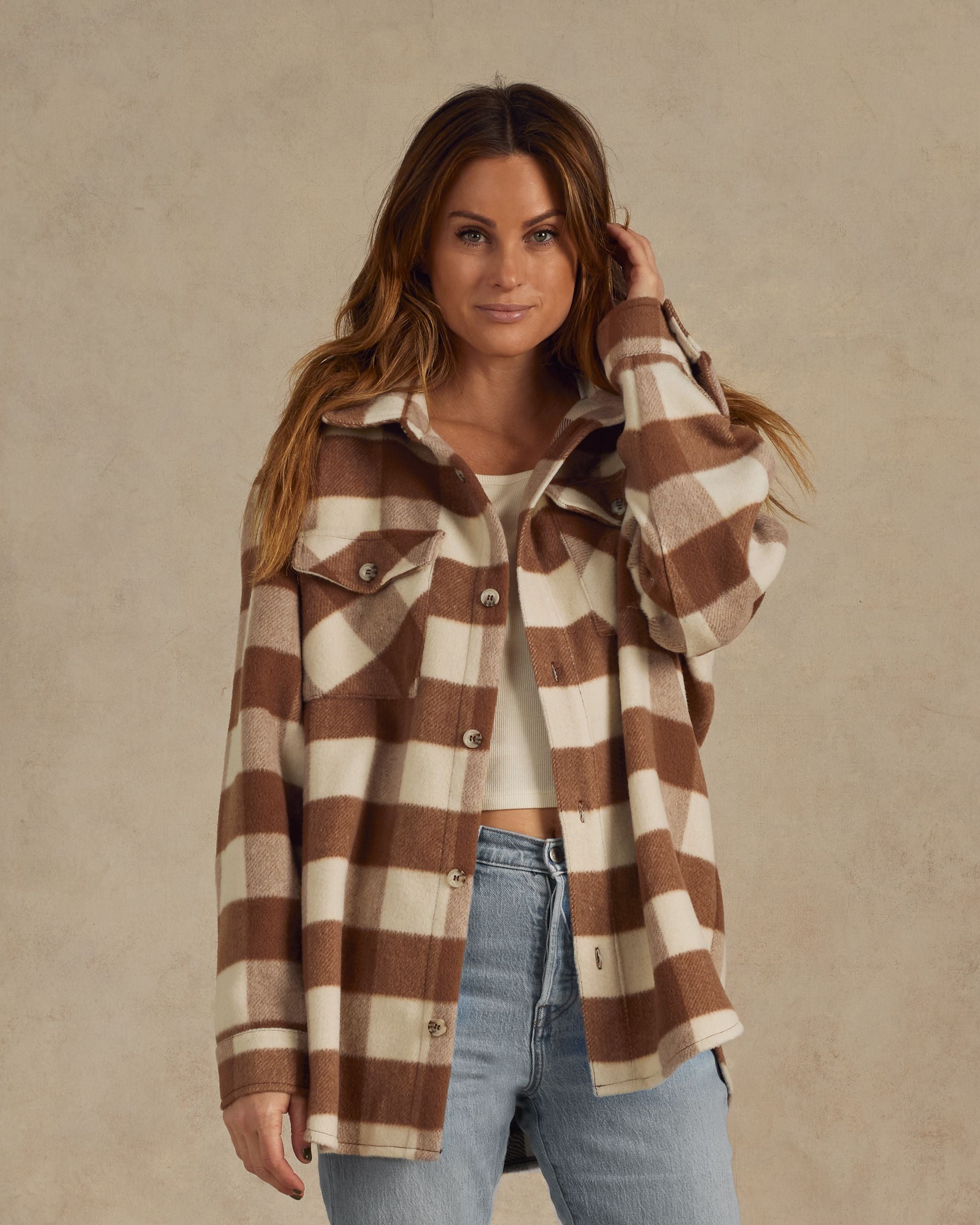 A curved bottom hem, front flap pockets, and relaxed fit, make this Cedar and Ivory Check Shacket your new everyday essential.