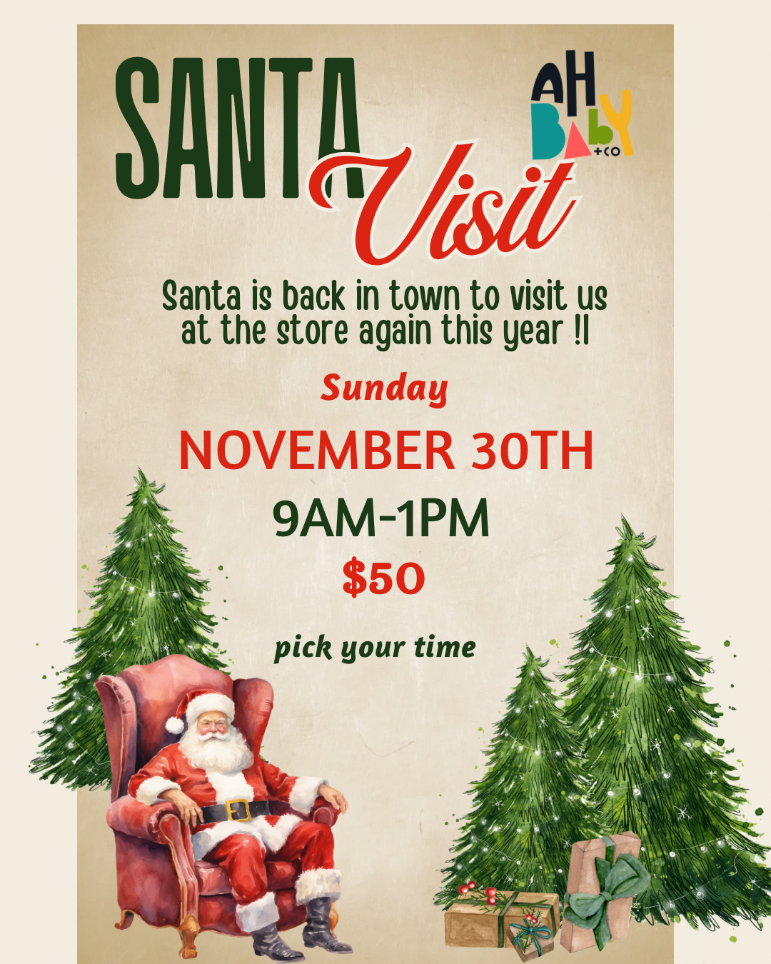 We are so happy to announce that Santa will be back at AH Baby + co on Sunday November 30th 2025.