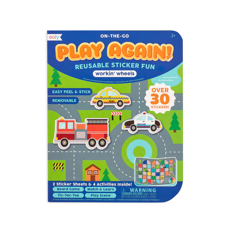 Whether you are traveling or in need of stay at home kids activities; this reusable sticker and activity book does it all. Imagine playing with cute cars and trucks stickers with no mess. Working Wheels Play Again Activity Book features a board game, match and learn, tic tac toe and a scene board to fill with colorful wheeled vehicle stickers.