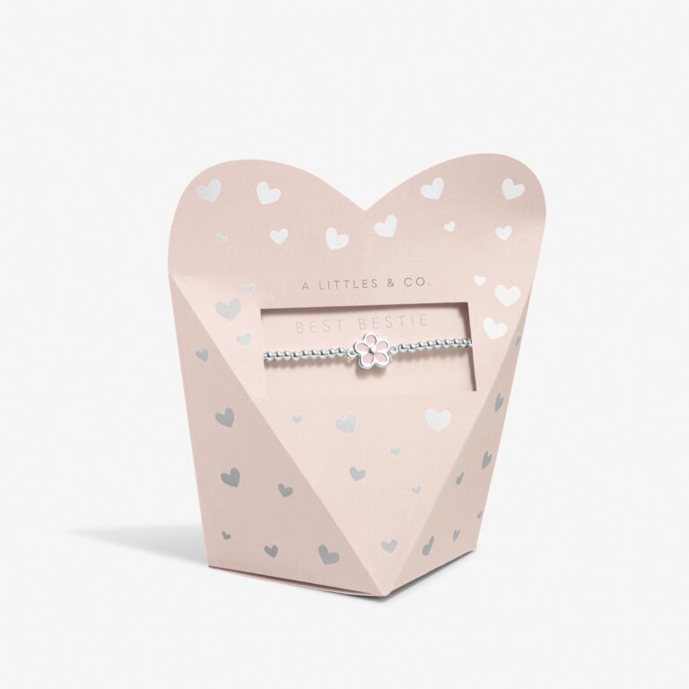 Displayed in the sweetest patterned heart-shaped box, our kid's From The Heart Gift Boxes are perfect for celebrating special moments with little ones. Our kid's From The Heart Gift Box 'Best Bestie' In Silver Plating features our classic silver-plated stretch design for smaller wrists and A Little flower charm - it's a wonderful addition to any little stack. .