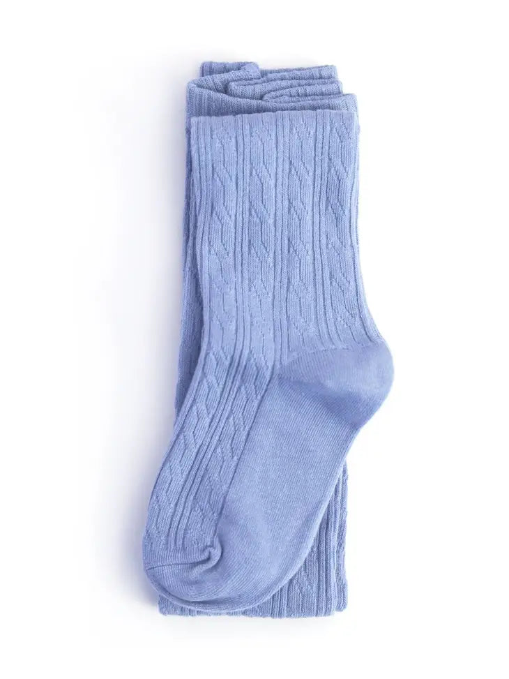 Cornflower blue cable knit tights for babies, toddlers and girls! Classic.  cute.  durable.  and now better than ever! Our cable knit tights are now made with a higher quality yarn that is even softer and more durable than before! Little Stocking Co. Cable knit tights are perfect for all occasions!  we love them dressed up with dresses and skirts or dressed down beneath a pair of denim shorts for a playful, edgy look! Our cable knit stockings are stretchy which makes them extremely comfortable and also allows them to fit a wide range of children.  tights do run big. if between sizes, we'd recommend sizing down for a better current fit.  Machine wash cold with like colors.  tumble dry low or lay flat to dry. 79% cotton / 19% polyester / 2% spandex