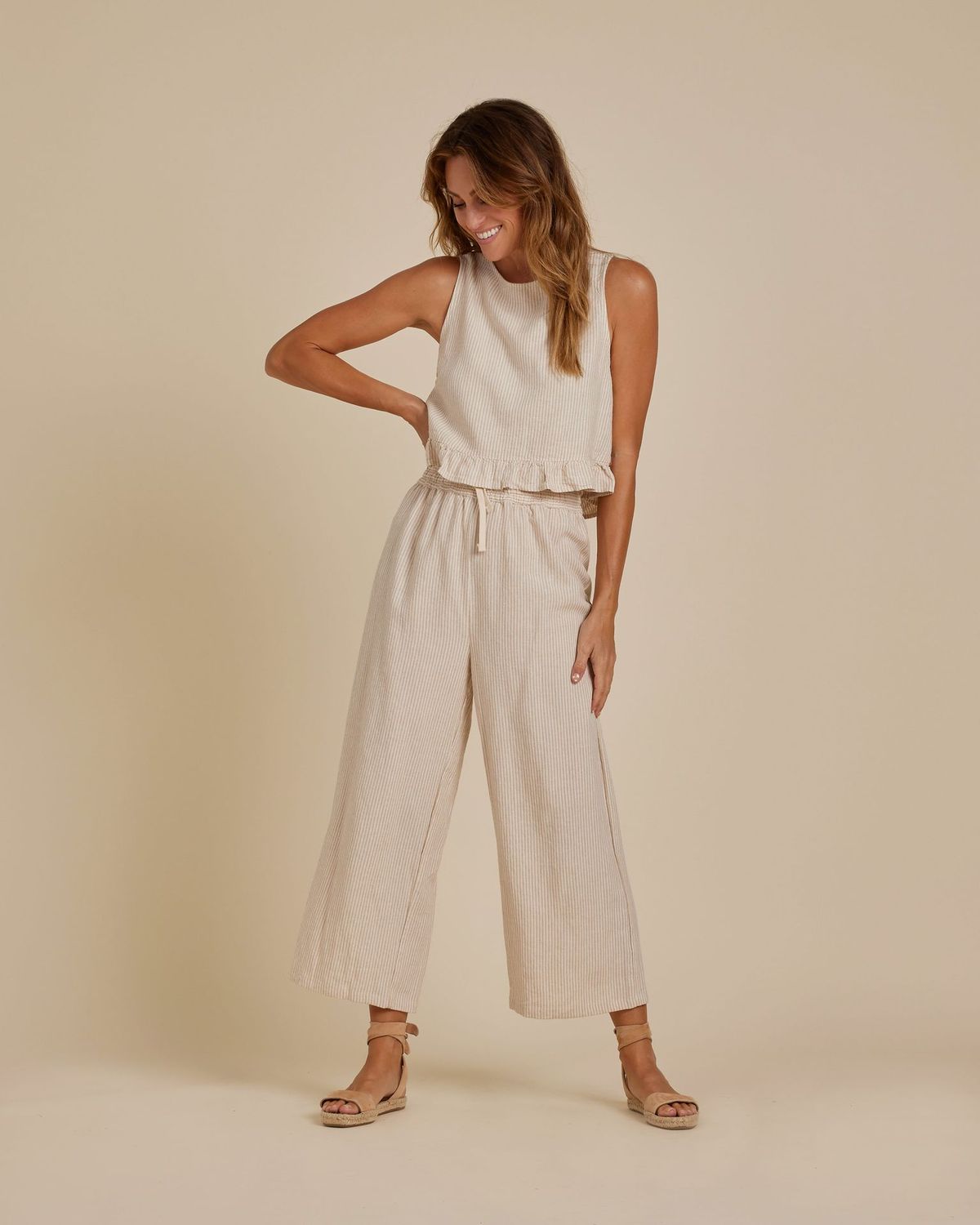 These wide-leg woven pants are stylish yet comfortable with an elastic waistband and rope drawstring. These look great with our coordinating Oceanside top!