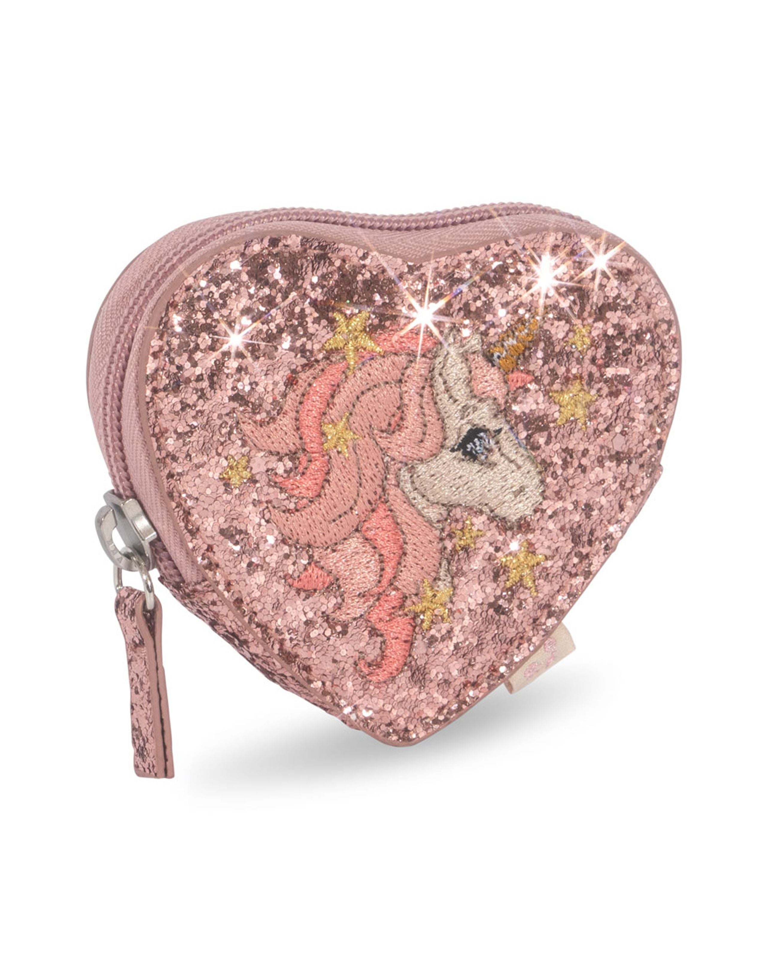 Tut Wallet by Konges Slojd. This sparkly little heart shaped purse features a glitter unicorn design and is perfect for carrying all your little treasures. With a zipper closure.