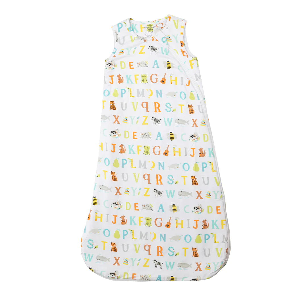 ABC print with animals in the design on this super soft and comfy sleeping bag with full zipper opening from bottom to armpit - Bamboo spandex blend for squishy soft stretchy feels, light poly fill.