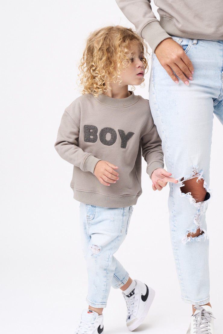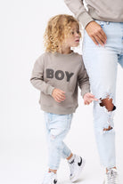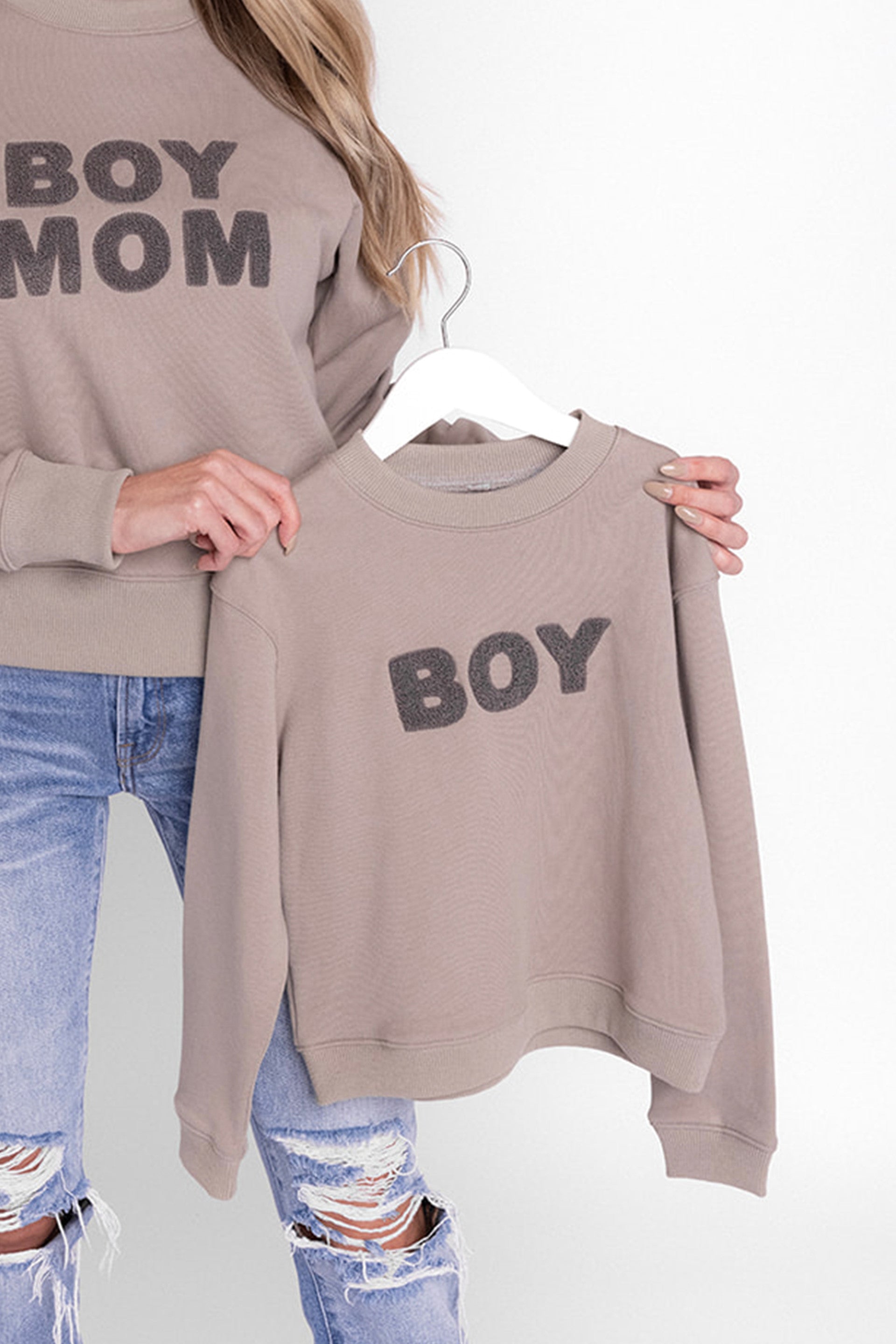 Flat gray BOY children's sweatshirt. The perfect gift for a new mom, baby shower, mother's day or just simply for the modern day mom's wardrobe. Pair it back to the BOY MOM sweatshirt for the perfect modern day mommy and me outfit.