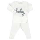 This cream two-piece set features the word "baby" written on the front of our super cozy 100% cotton tee in soft, deep blue yarn. With matching cream pants, this outfit is perfect for any baby! This set is handmade with love in Minnesota.