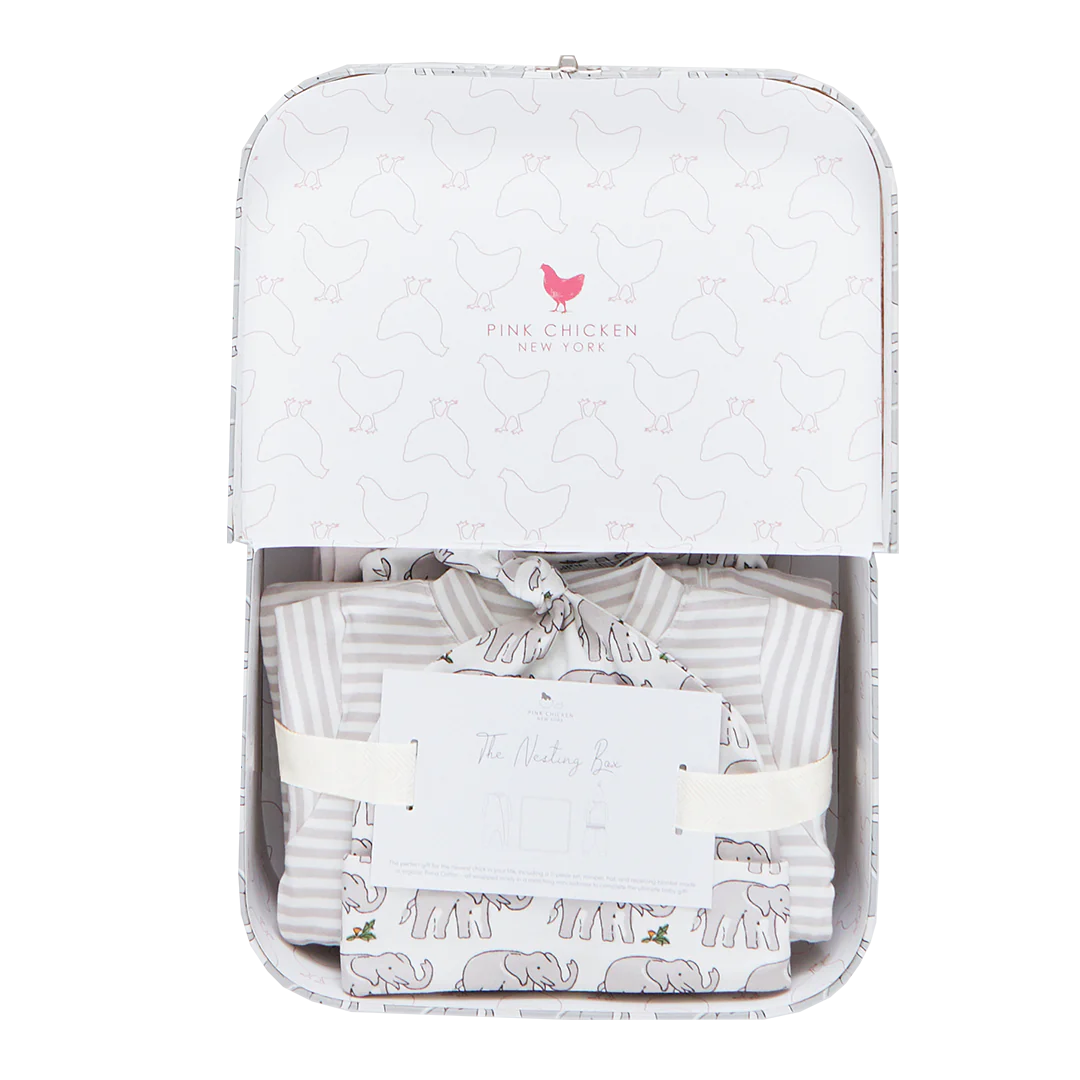 New & Noteworthy! Spoil the newest chicks in your flock by feathering their nest with our new Baby Organic Pima Cotton take home set in Gray Elephant. Inside an adorable printed mini-suitcase rests a complete collection of newborn necessities in classic Pink Chicken prints and patterns. Box includes: one printed wrap top with fold-over mittens, one elastic waist solid pant, one printed knotted hat, one long sleeve zipper footie with fold-over mittens and zipper protector and one printed take home blanket with contrasting print on reverse side. It's the perfect newborn gift set for your work bestie, favorite cousin, roommate from college or any new mom in your life. Keep mom and baby connected with our matching Womens Organic Pima Cotton Robe. GOTS certified. Inks & dyes classified as eco-friendly by OEKO-TEX standard.