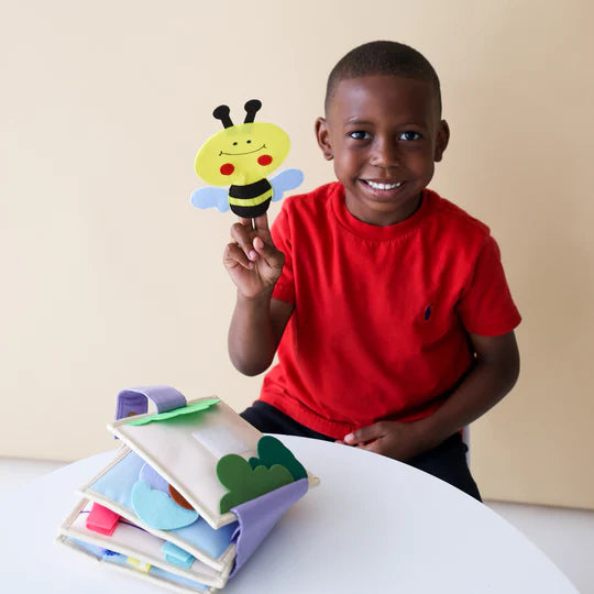 Experience the magic of our interactive quiet book! The front page features an adorable finger puppet bee, teaching the importance of conservation or providing endless fun chasing and stinging everyone. Open it up to discover a charming cow creative play page with a toothbrush and flower for practicing routines. Explore a delightful zipper bathtub with a turtle and a hedgehog threading page for fine motor skills. Engage in a pumpkin button maze with a peekaboo mouse and enjoy the farm truck with elasticated button wheels on the final pages. On the opposite page, a farm scene awaits with a variety of veggies for imaginative play and basic math activities. Let your little ones explore the garden, load the truck, and play kitchen!