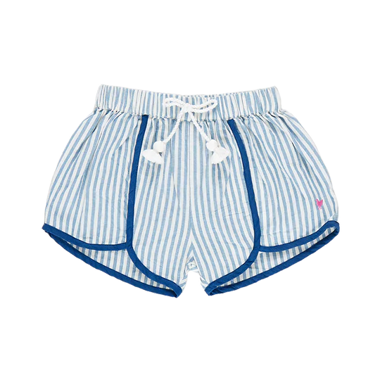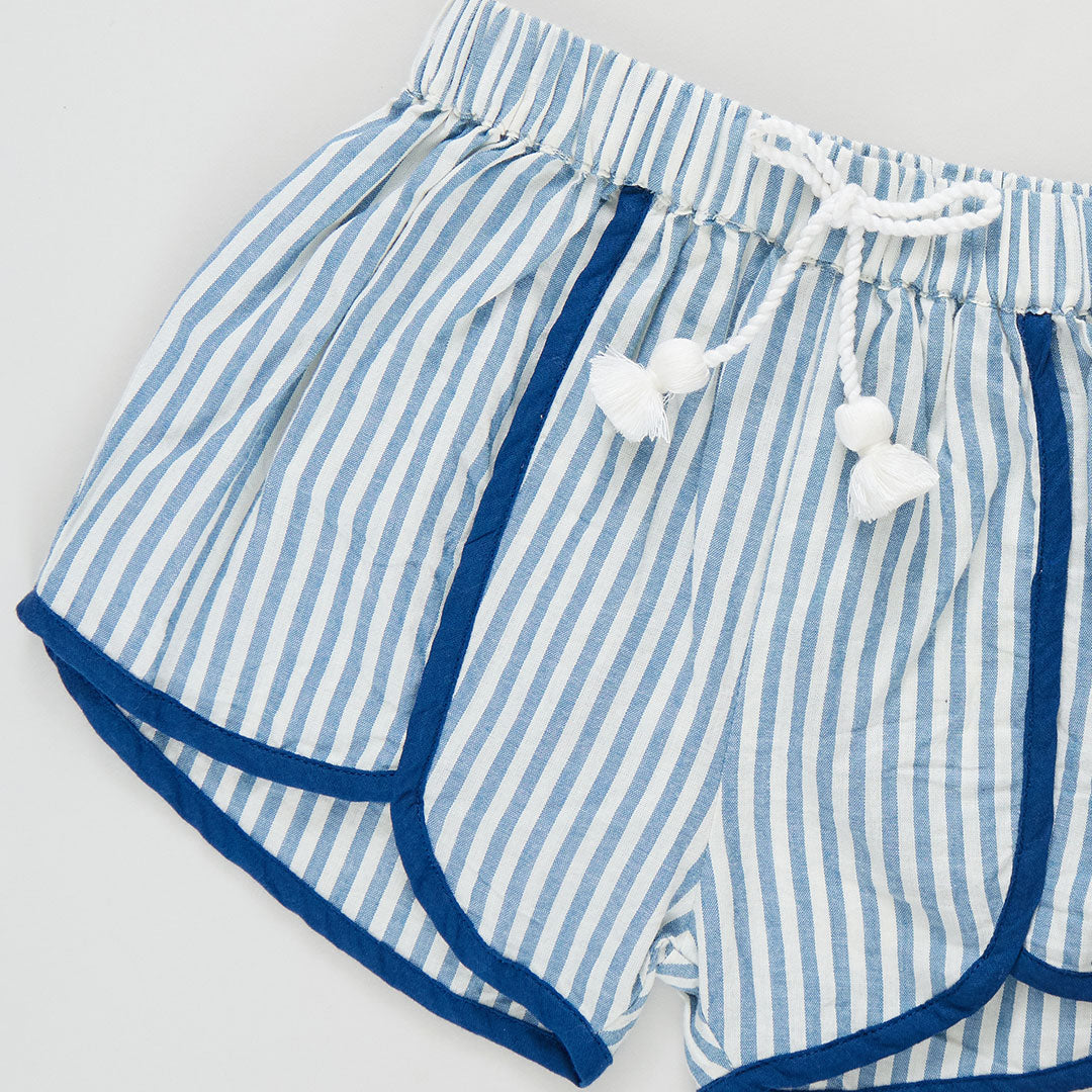 Show us your stripes! Vertical stripes in blue and white lend a seaside vibe to our sporty Girls Millie Short. Tassel accents and lavender trim detailing evoke a fun, free-spirited sensibility. An elasticized waist and easy to wear pull-on design make these shorts a real Spring go-to from playground to picnic. Find our Blue Skinny Stripes throughout the collection, making Mommy & Me looks easy breezy.