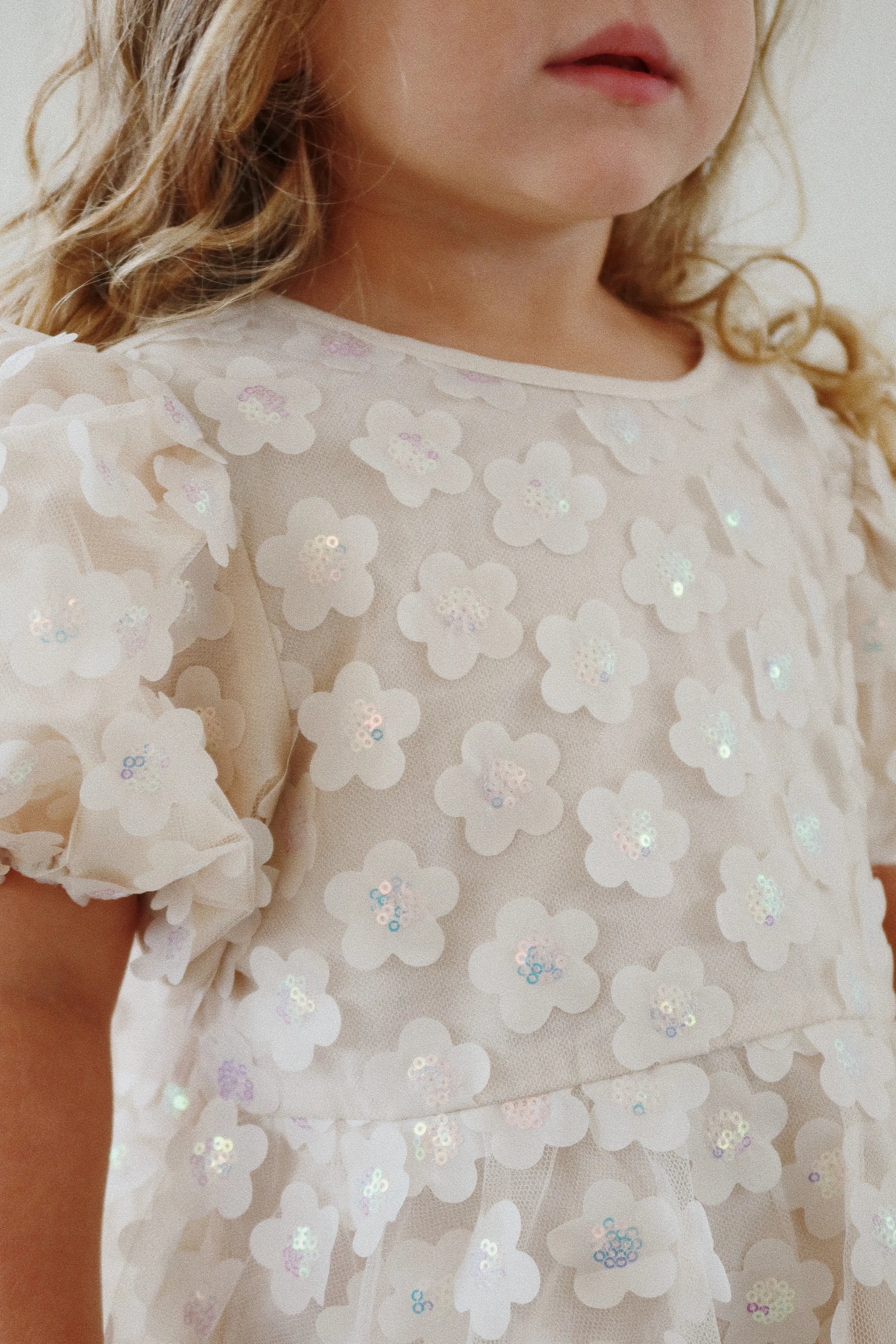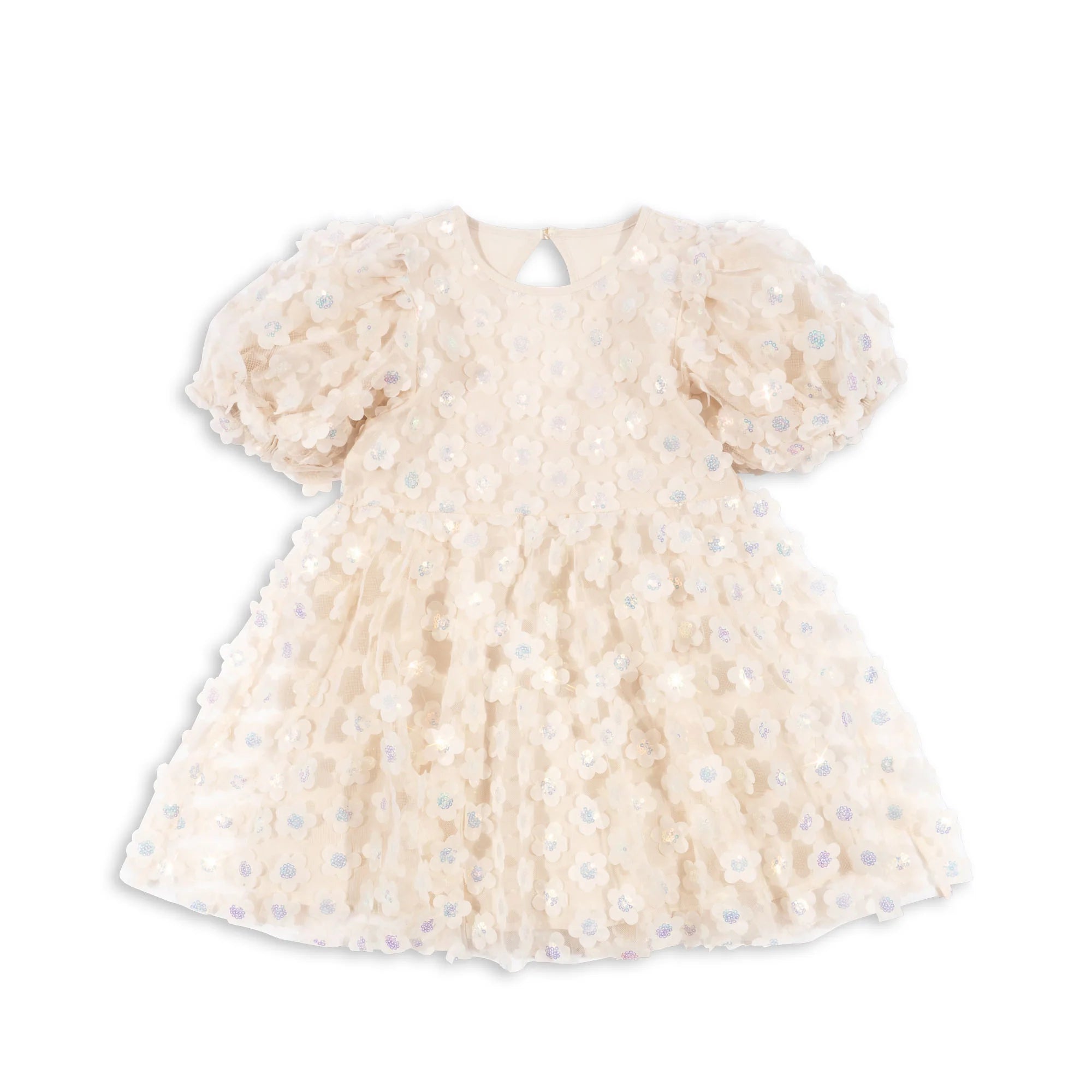 Layered dress with puffy sleeves and sequin flower attachments.