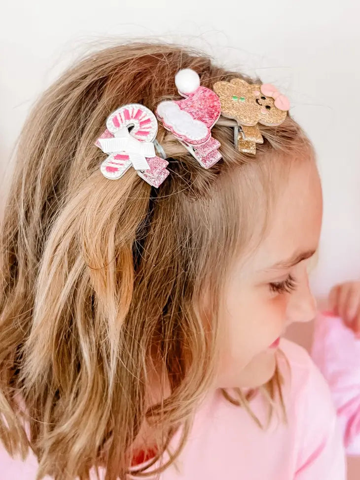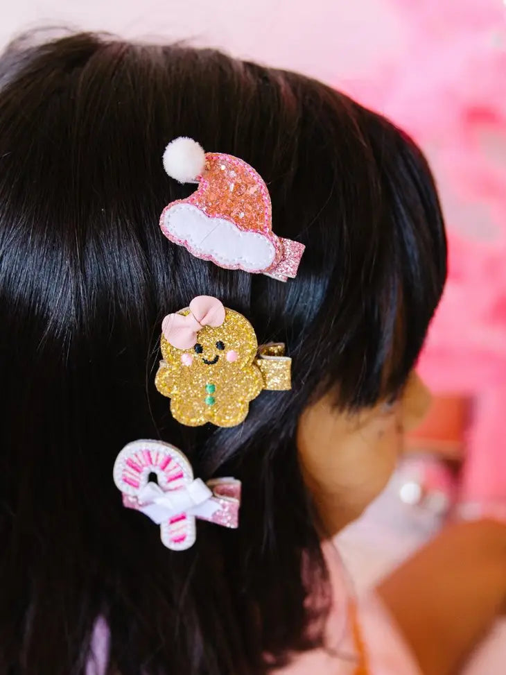 This clip set includes: * 1 pink glitter santa hat hair clip * 1 gold glitter gingerbread hair clip * 1 pink and white candy cane hair clip Customers love Sweet Wink hair clips because: * Each alligator hair clip is ribbon-covered to grip the hair * One size fits all * Glitter accents are "shed-free"