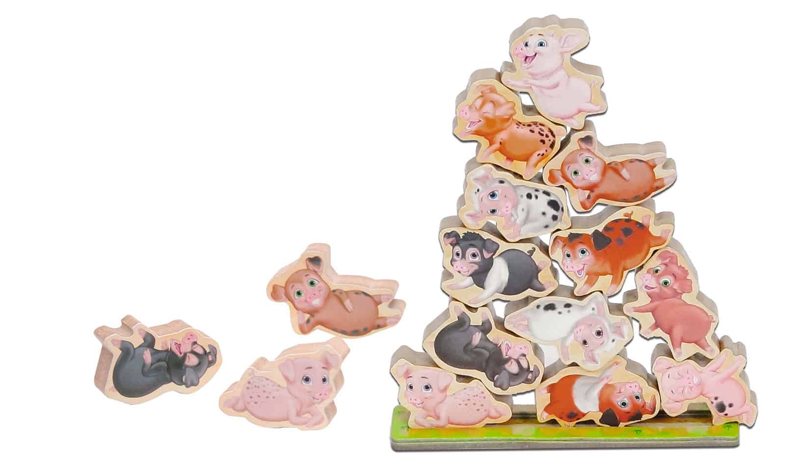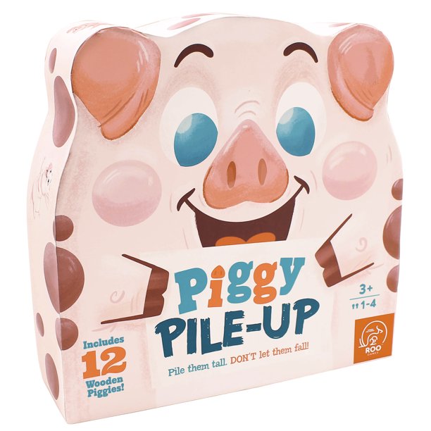HOW TO PLAY: Players take turns drawing Piggy pieces from the draw string bag until all of them are drawn. Put aside any extra piggy pieces so that everyone has the same amount. On you turn, place a piggy piece on the mud puddle base or a piggy already in the mud puddle. Don’t let any pieces fall!