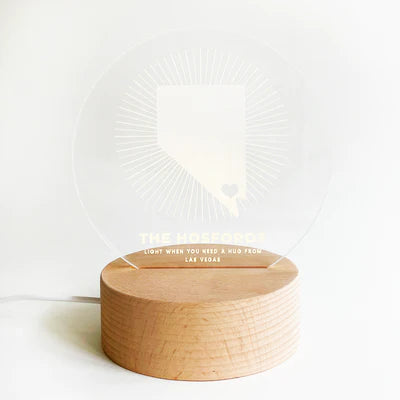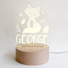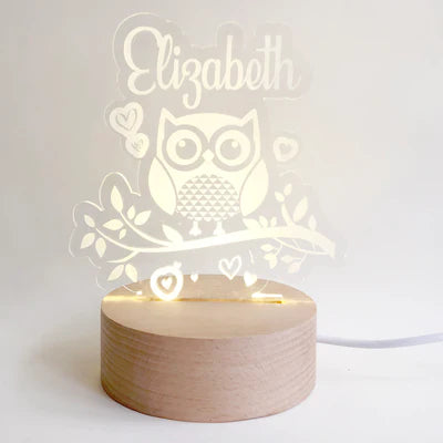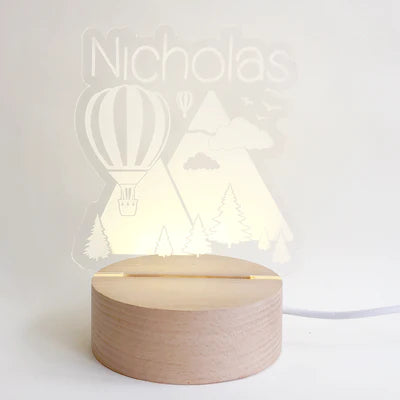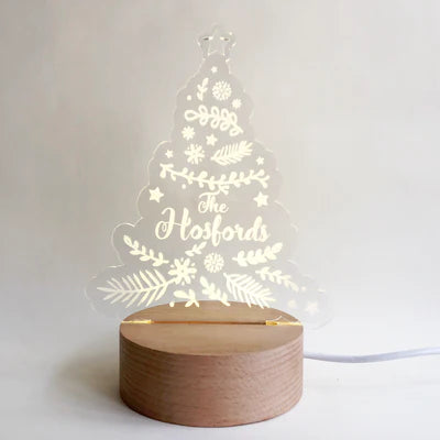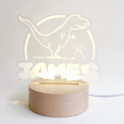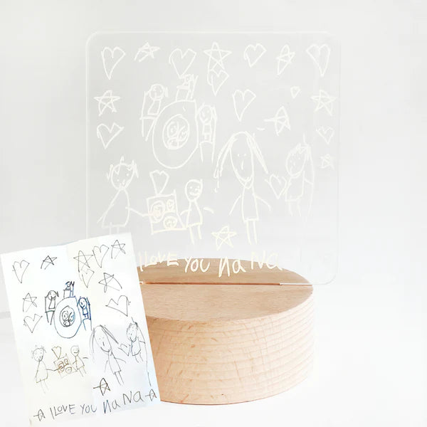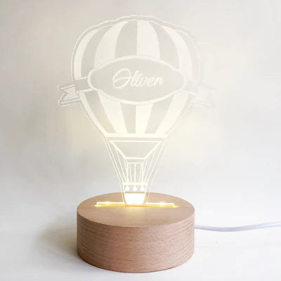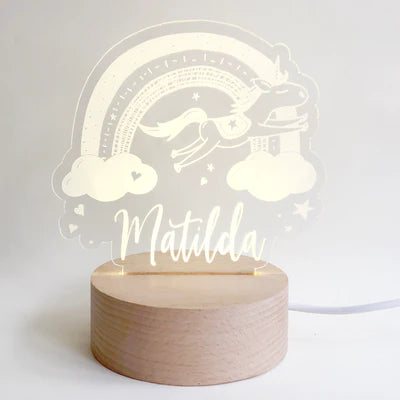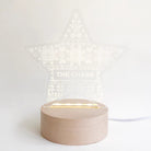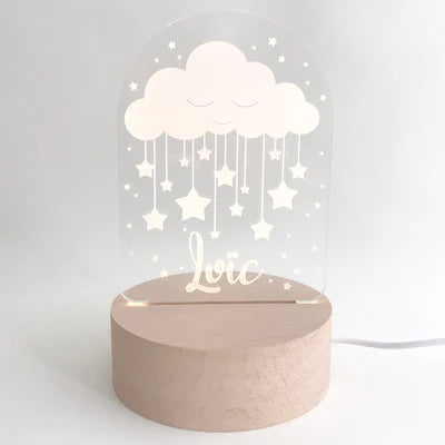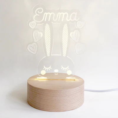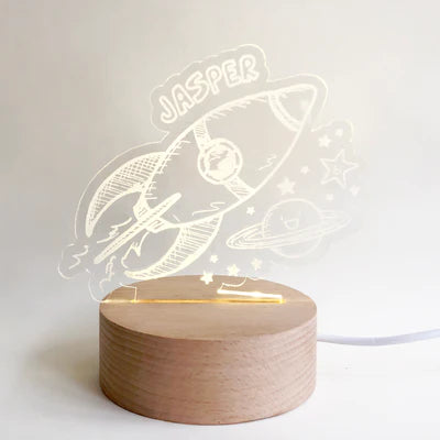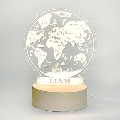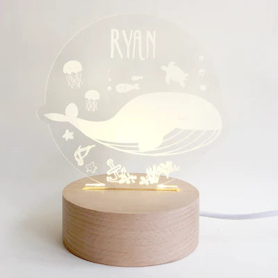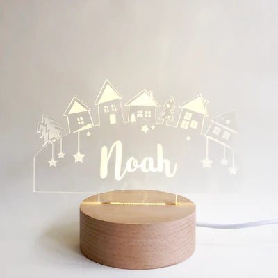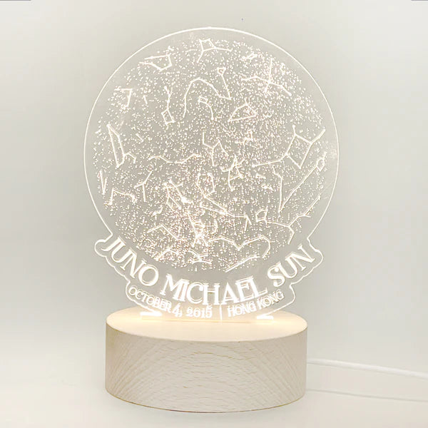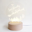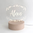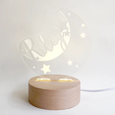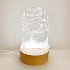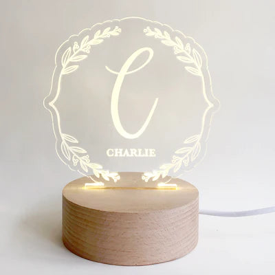 Personalized with name | Engraved or UV printing on clear acrylic plaque inserted into round wooden base | Maximum measurement of 18cm | LED light strip and USB on/off switch used.