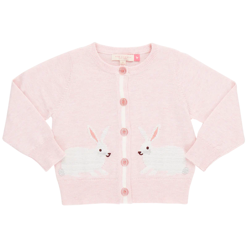 Some bunnies to love! Two is better than one when it comes to the adorable cottontails ready to hop right into your heart from our Baby Girls Maude Rabbit Sweater. A shimmery chenille tail and silvery thread throughout really brings our bunnies to life. A crisp white stripe down the button placket highlights our signature pink glitter buttons and hand embroidered eyes and whiskers give these little thumpers a cheeky wink and a smile. Wear over any of our fabulous Easter dresses and bubbles for a whimsical warm-up. Twin with our Girls Maude Rabbit Sweater for a delightful Big Sis / Little Sis look.