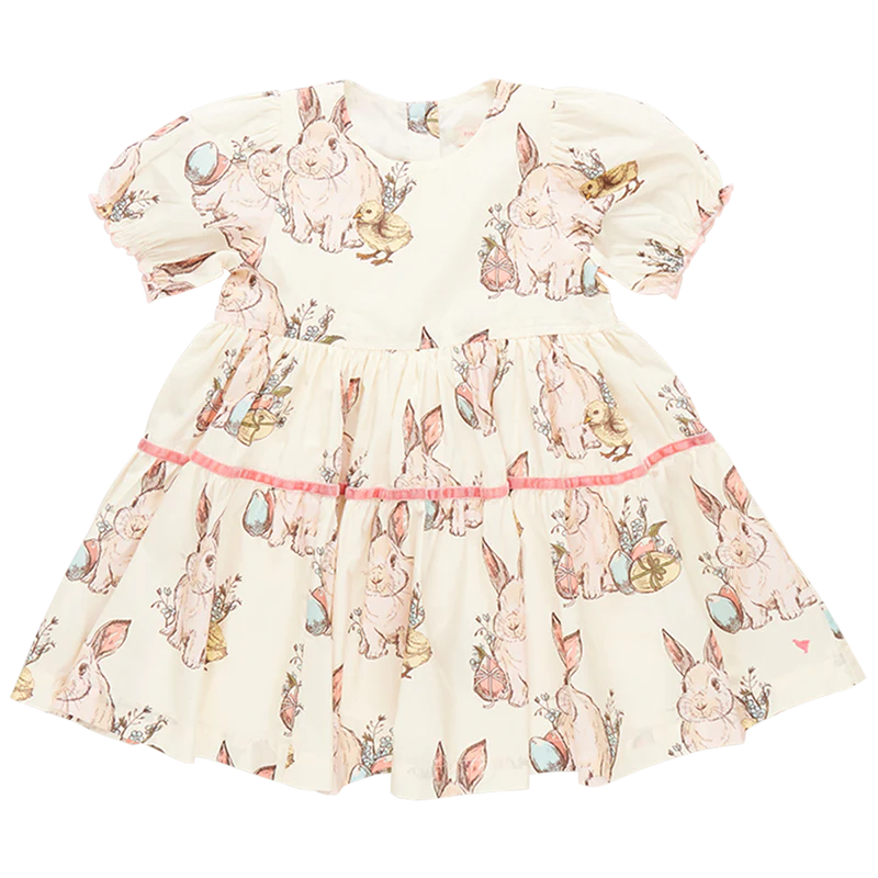 Hop into Easter style! Fluffy yellow chicks and adorable pink bunnies on a creamy ground create a nostalgic conversational print, shown here on our Girls Maribelle Dress. This 2-tiered fully gathered dress is brimming with designer details. A 3/4 length puff sleeve, petal pink velvet ribbon accent at the hip and our signature glitter button back closure are what set this piece apart. All the aunties and grandmas are going to love this one! Match with our Girls Gianna Skirt and Baby Girls Maribelle Dress Set for a vintage Big Sis / Little Sis moment.