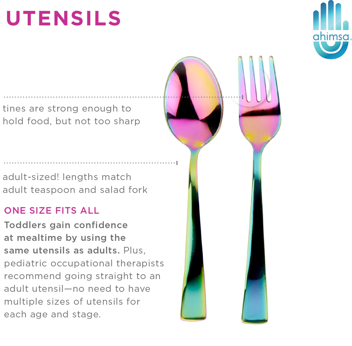 - Forks & spoons: rounded fork tines for safety. Size promotes early motor skills and confidence.