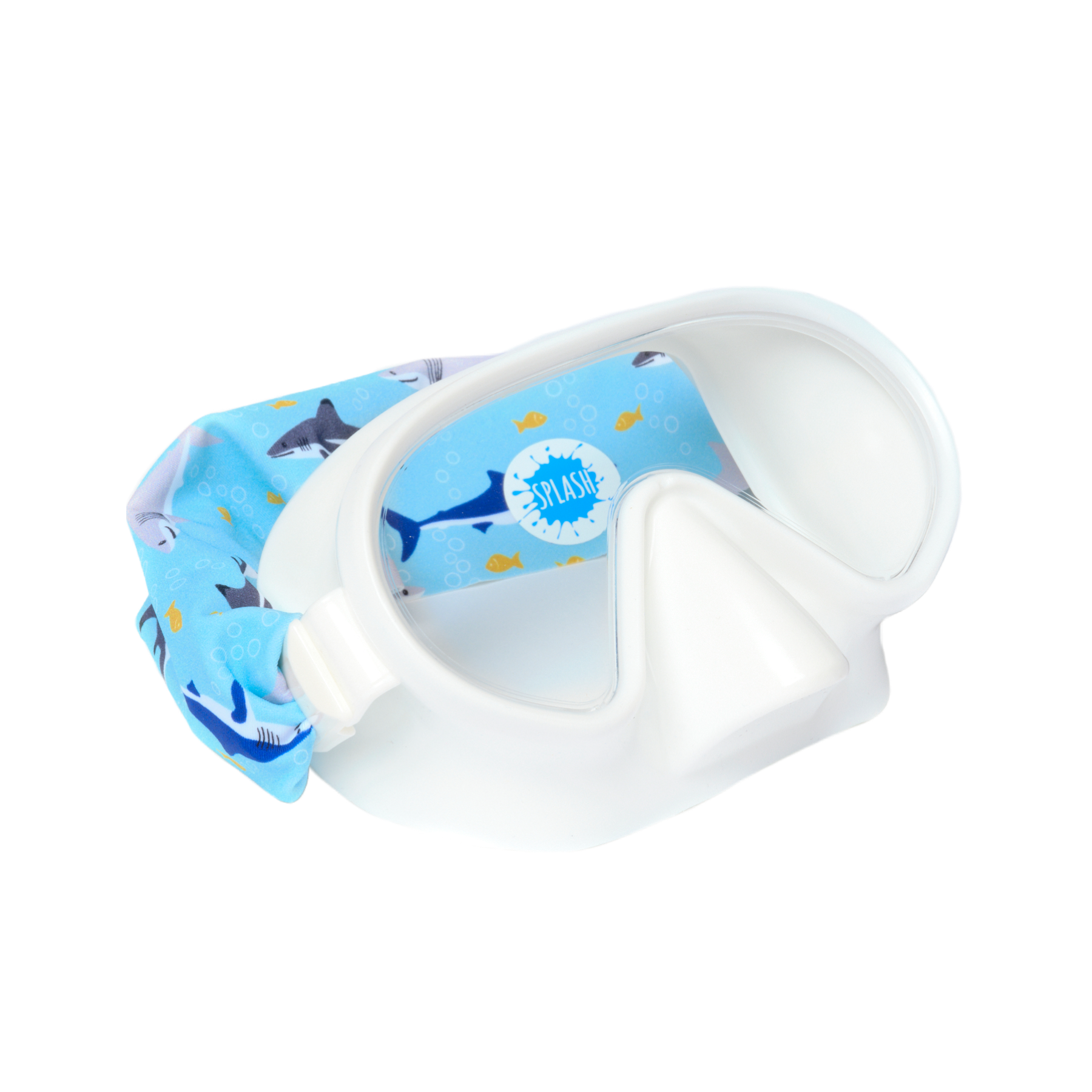 Our Shark Attack face mask swim goggle features our tangle-free, patent-pending strap in a shark print on a bubbly blue background. Paired with a white frame and clear lenses.