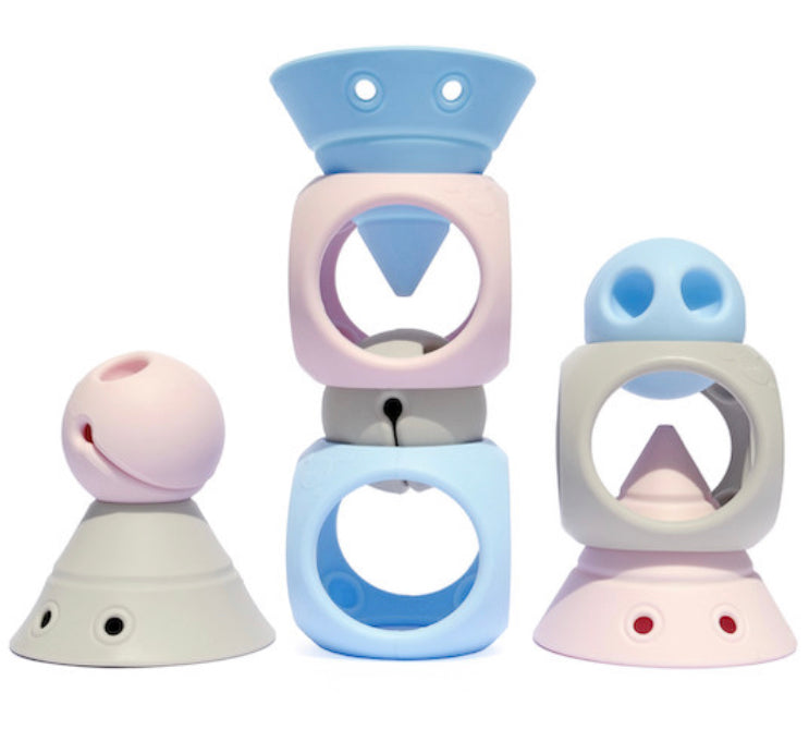 It features the Hix - three silicone rubber cones that can fold, flip, and stack endlessly - the Mox - right-side, inside-outside face-making rubber balls - and the Oibo - a set of elastic, stackable, rollable, squeezable, easy-to-grip sensory cubes.