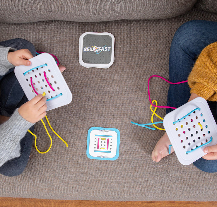 Working as quickly as they can, players race to thread their strings through their board so it matches the picture on the card.
