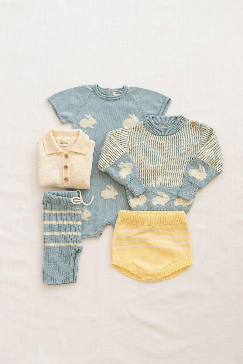 all the spring feels in the medium weight chunky knit sweater featuring bunnies across the bottom in a contrasting shade, what better way to say Easter than in this festive top! classic wooden buttons at shoulder to assist with dressing up to size 18/24 months