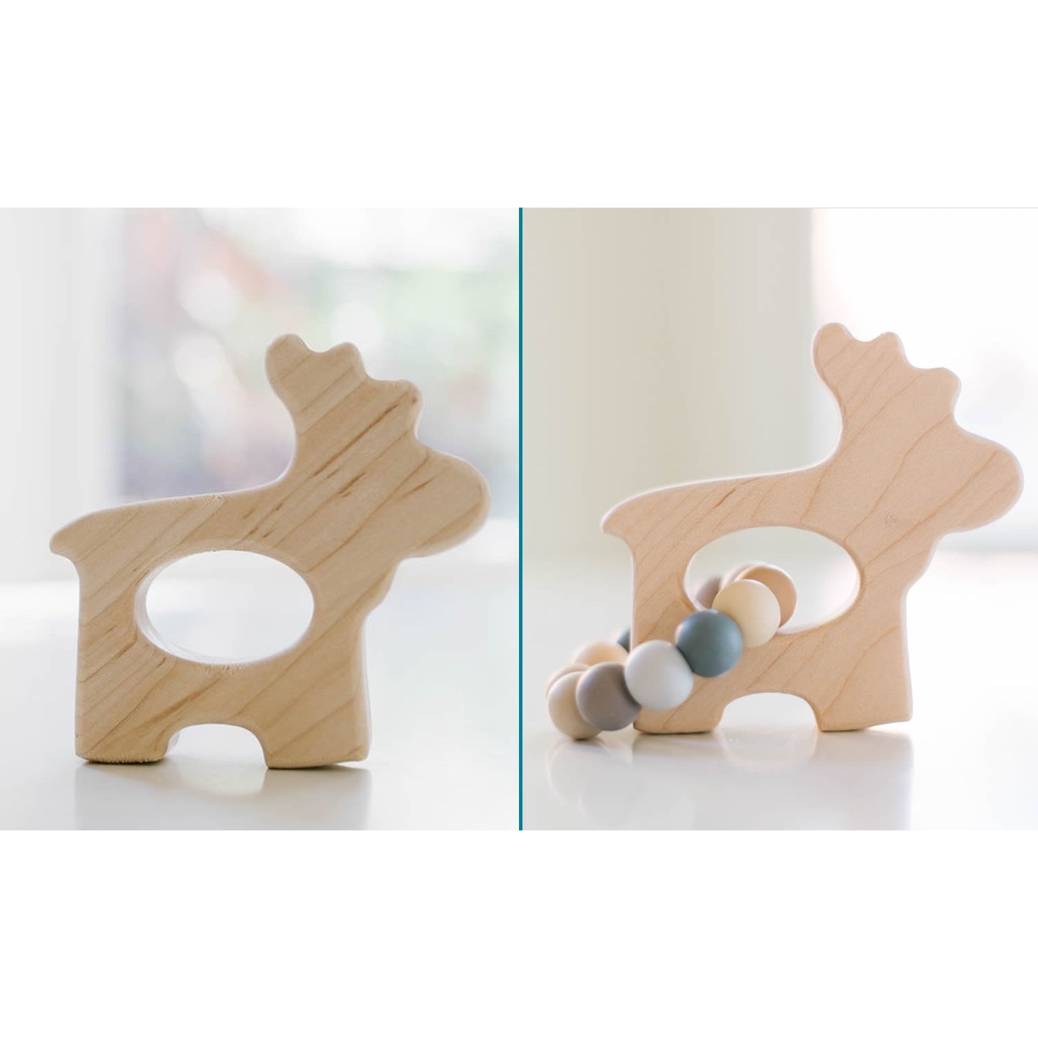All toys come sanded satin smooth and left natural with no finish. The moose is approximately 3.5"x 3.5" with a grasping hole in the center.