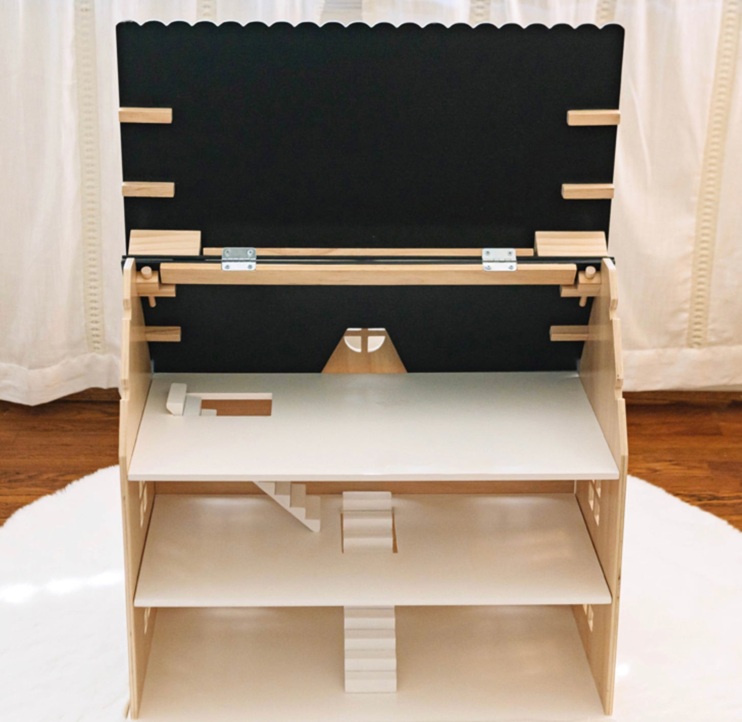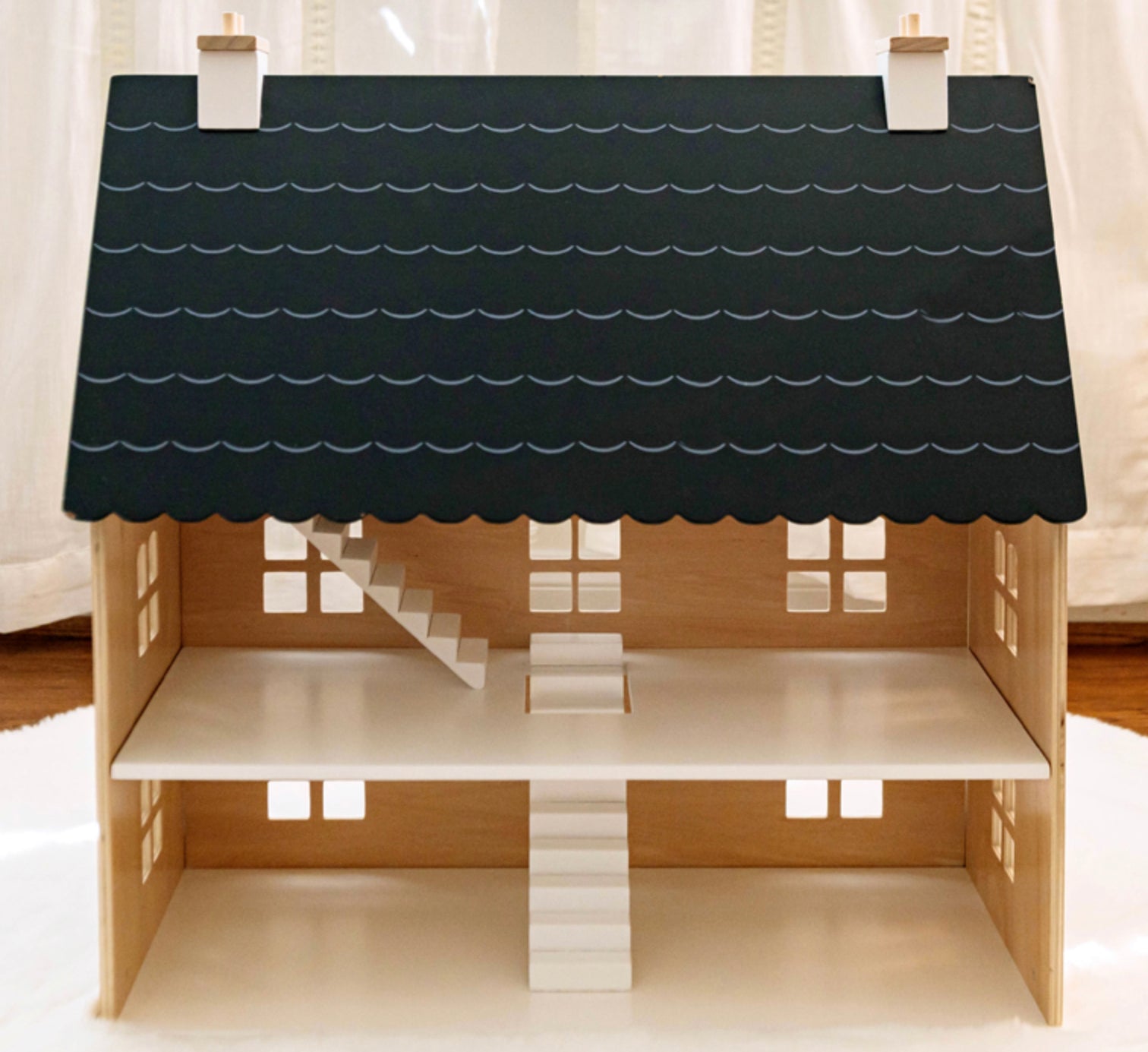 Our Dollhouse can be called “Home Sweet Home” for all your little one’s little ones. One side of the house boasts 5 4-pane windows with shutters and a dormer on the top floor. Flip it around, and there are 2 stories with 4 rooms ready for furniture. Lift the roof, and you’ll find the bonus room. Two sets of stairs lead the way from first to 2nd floor, and from 2nd floor to 3rd. Made of Plywood, solid wood and MDF, our sturdy dollhouse is easy to assemble. Pair with our Dollhouse Furniture and bring it on home!