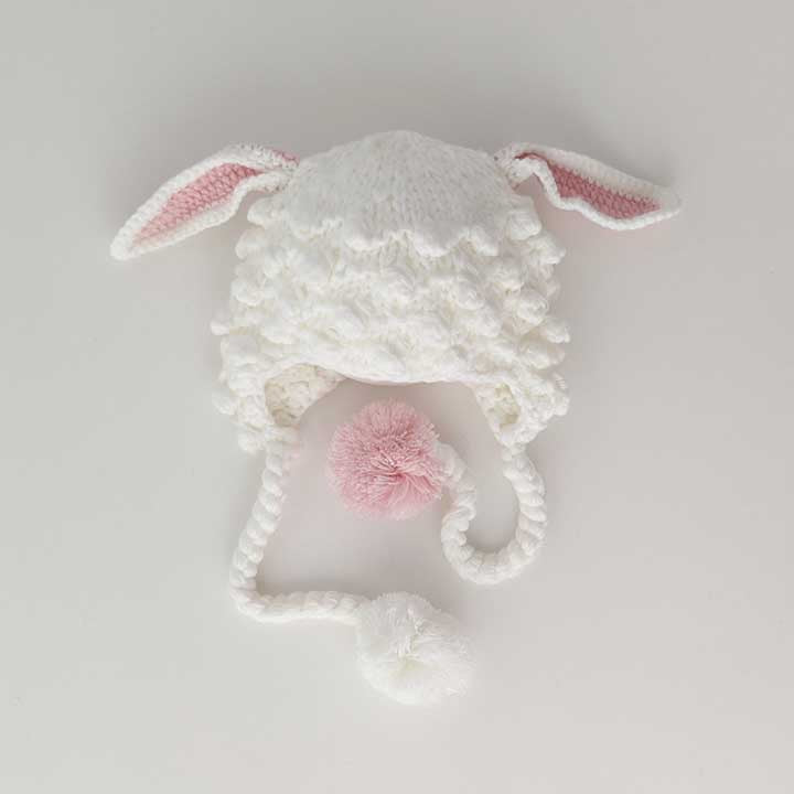 Dress your little lambkin in our adorable cotton knit hat with sweet pink lambs ears. Hat has earflaps and pom poms in pink and white. Match with our Lambkin Legwarmers to complete the look.