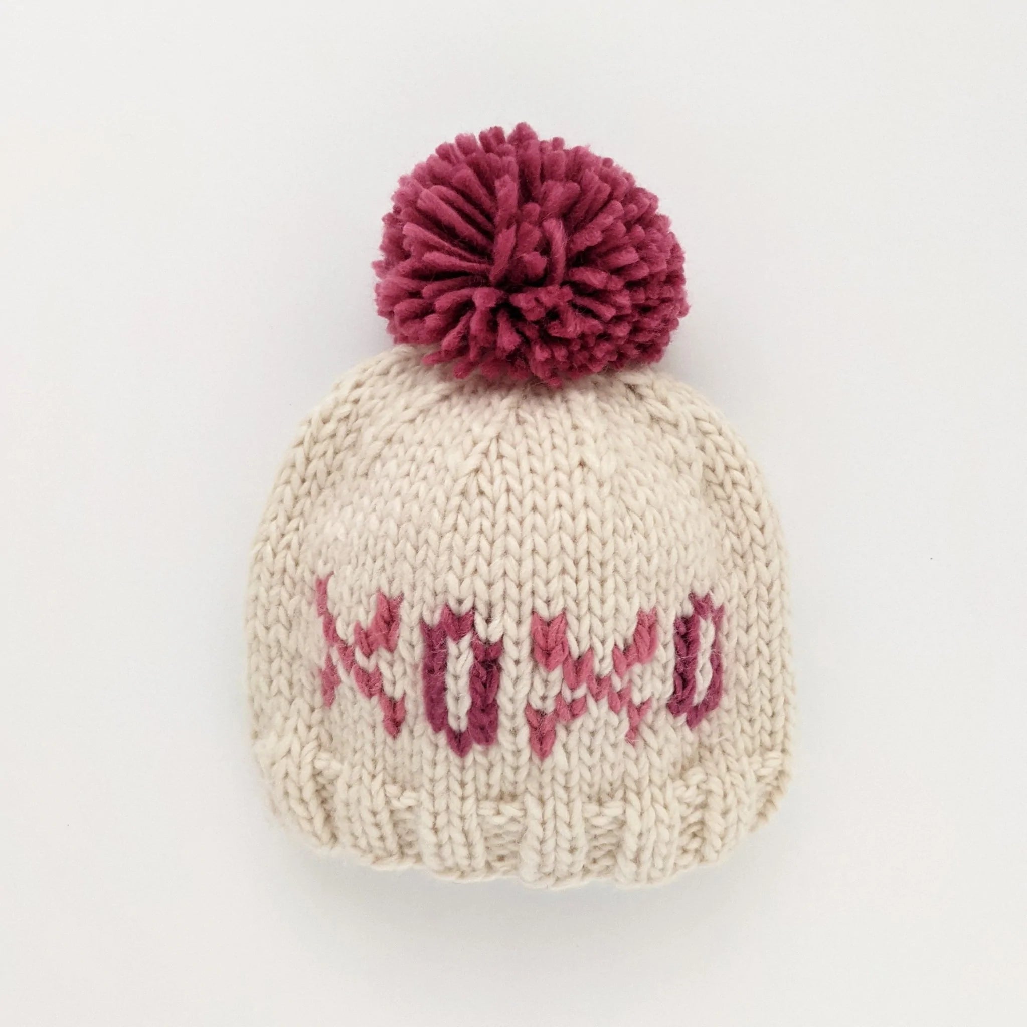 Send your Valentine hugs and kisses with a fun hat that says 'XOXO'! This beanie is hand knit in cozy natural hued yarn with the letters 'XOXO' in Cerise and Rose hued yarn. Topped with a Rosy hued yarn pom pom, this looks great with everything and is a fun gift for baby or any little person you know.