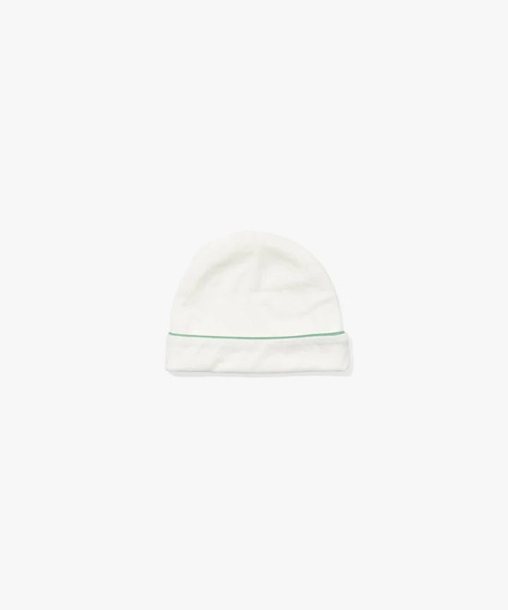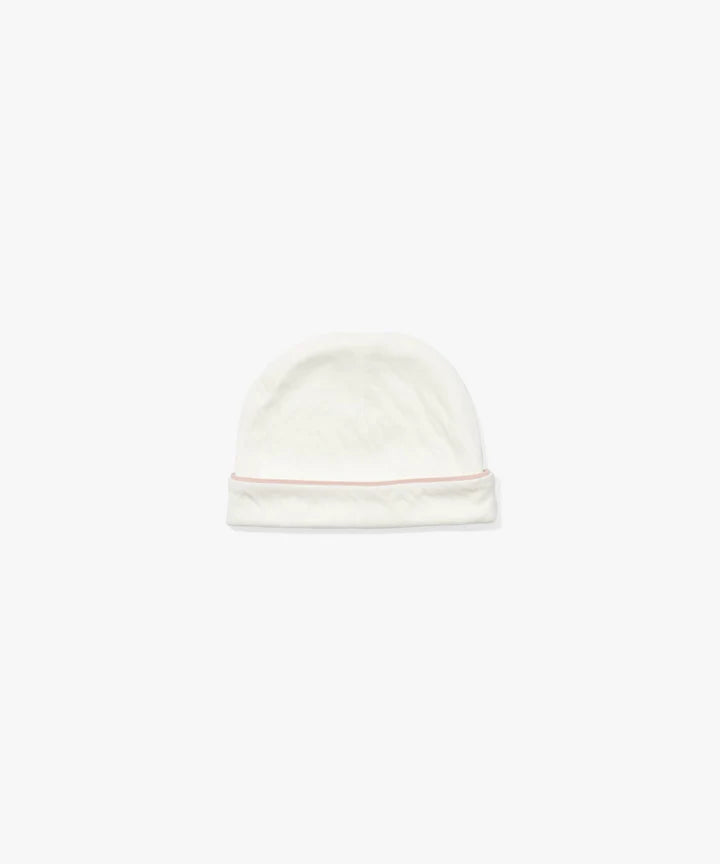 Our 100% organic cotton baby hat keeps your baby's head nice and warm. Made from super soft double-cloth jersey, this fully lined hat has no exposed seams or tags. The Italian cotton piping is a perfect match with our crossbody onesie.