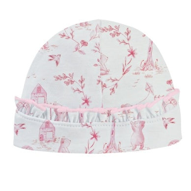 Expertly designed with a delicate hand-painted watercolor print, our Toile De Jouy Pink Printed Hat With Ruffle is the perfect addition to any outfit. Made from 100% Peruvian Pima Cotton interlock, it offers both luxurious comfort and beautiful style. Upgrade your wardrobe with this sweet and charming hat.