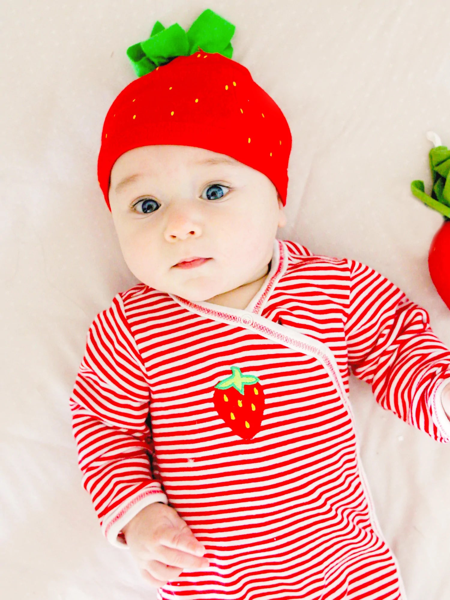 A sweet strawberry organic cotton baby knit beanie with strawberry seeds and a little leaf detail on the top of the beanie. Made to fit close and snug to baby's head for extra warmth and comfort with the perfect amount of stretch. This strawberry beanie for babies is designed to coordinate perfectly with our new Fruit and Veggie layette collection.