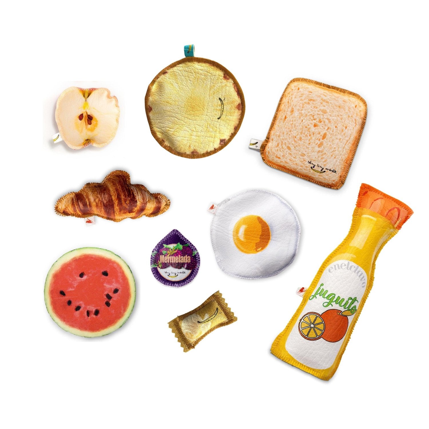 CONTAINS: BUTTER, BERRY JAM, FRIED EGG, ORANGE JUICE, CROISSANT, PINEAPPLE, RED APPLE, WATERMELON, TOAST
