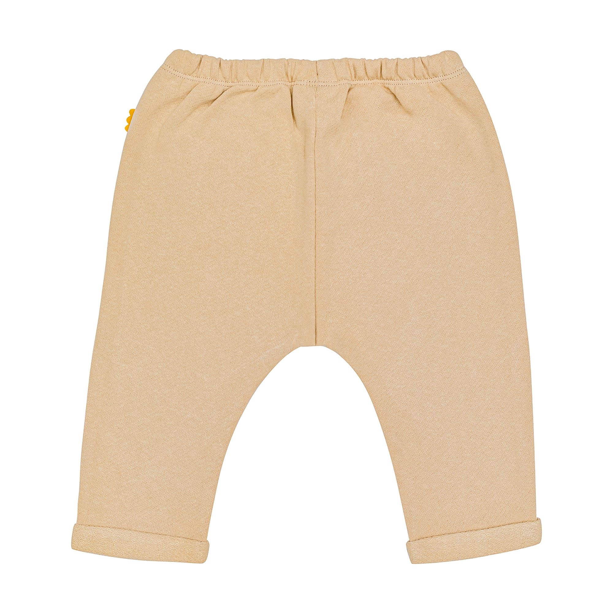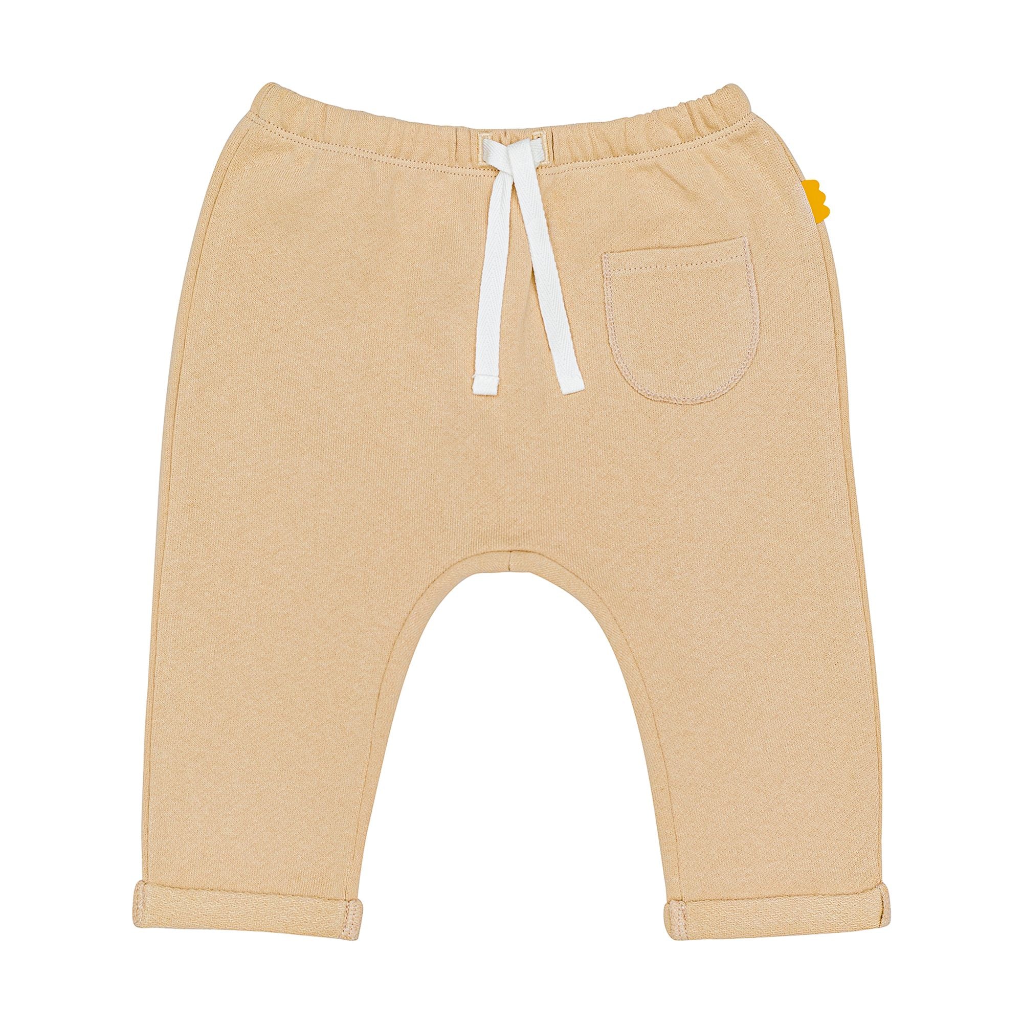 Beige Baby Harem Pants in Winter Fleece. Drawstring waistband and front patch pocket.