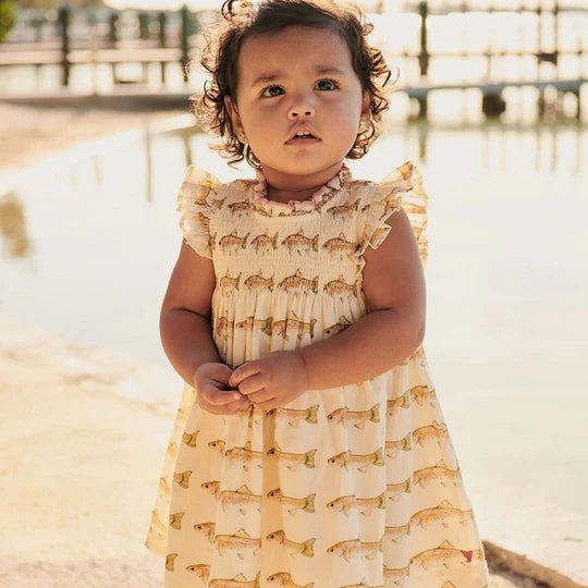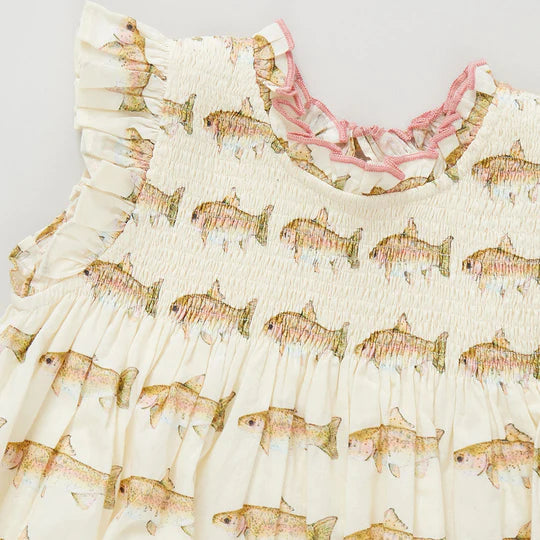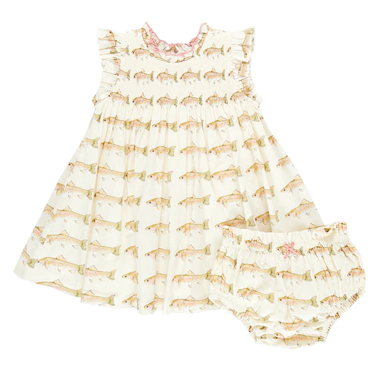 In collaboration with Helmsie, our Baby Girls Stevie Dress Set features classic smocking at chest and a radiant rainbow trout print that are true to Pink Chicken's breezy vintage style. Pink tipped ruffled sleeves and neckline add to the charm. Fully lined with zipper closure. An elastic waist matching diaper cover with fixed bow completes the set.