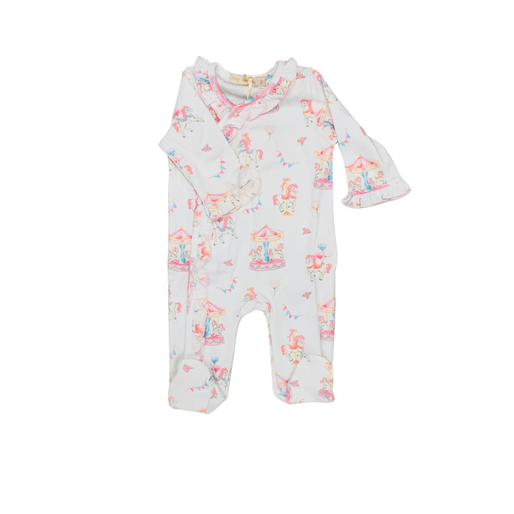 Introducing the Carousel Footie - the perfect addition to your baby's wardrobe. Made with a beautiful carousel pattern, this footie brings a touch of whimsy to any outfit. Crafted with soft, comfortable material, it's perfect for keeping your little one cozy and stylish. A must-have for every fashion-forward baby.