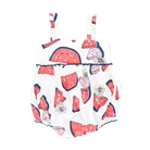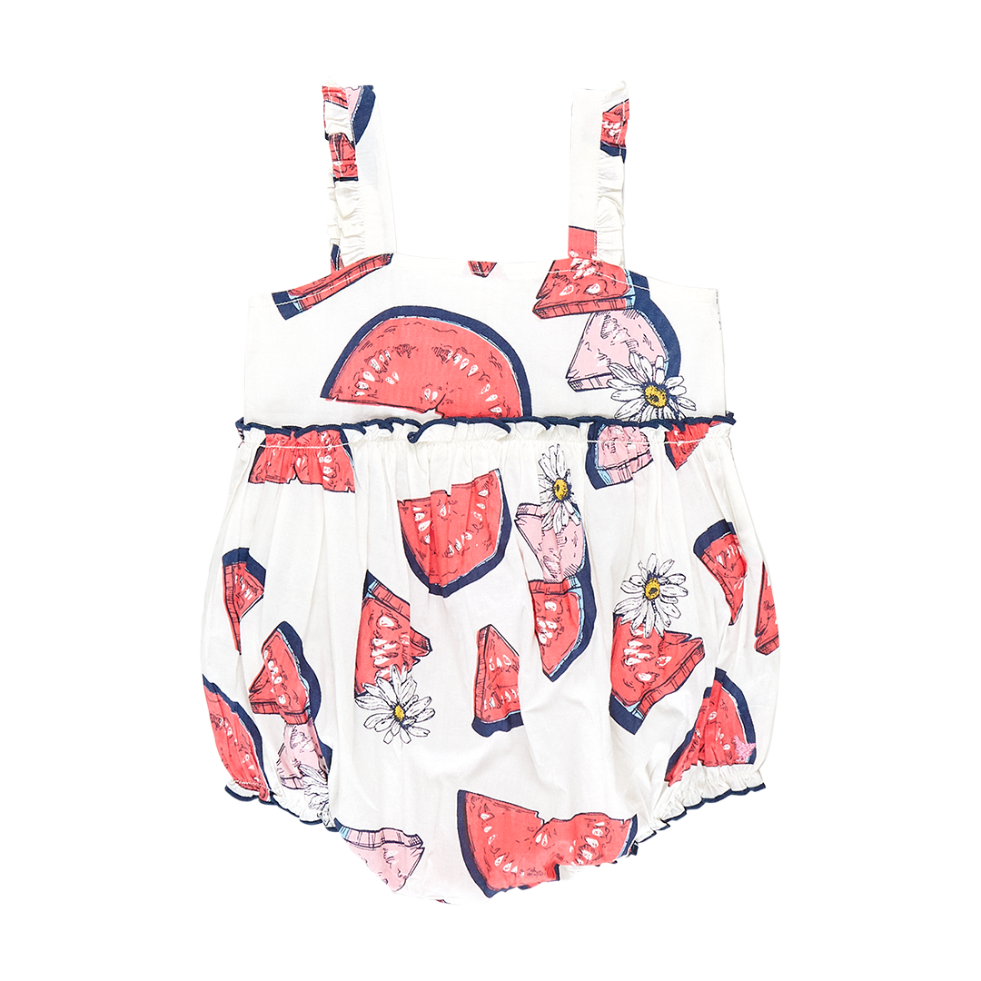 Summer’s Sweetest Treat! Scattered wedges of juicy watermelon sweeten a crisp white ground on our Baby Sierra Bubble. A contrasting navy ruffle across the chest and smocked back define the delightful shape. Ruffled shoulder straps and forgiving navy tipped elastic leg openings make it easy for baby to move. Ring snaps at bottom allow for easy diapering.