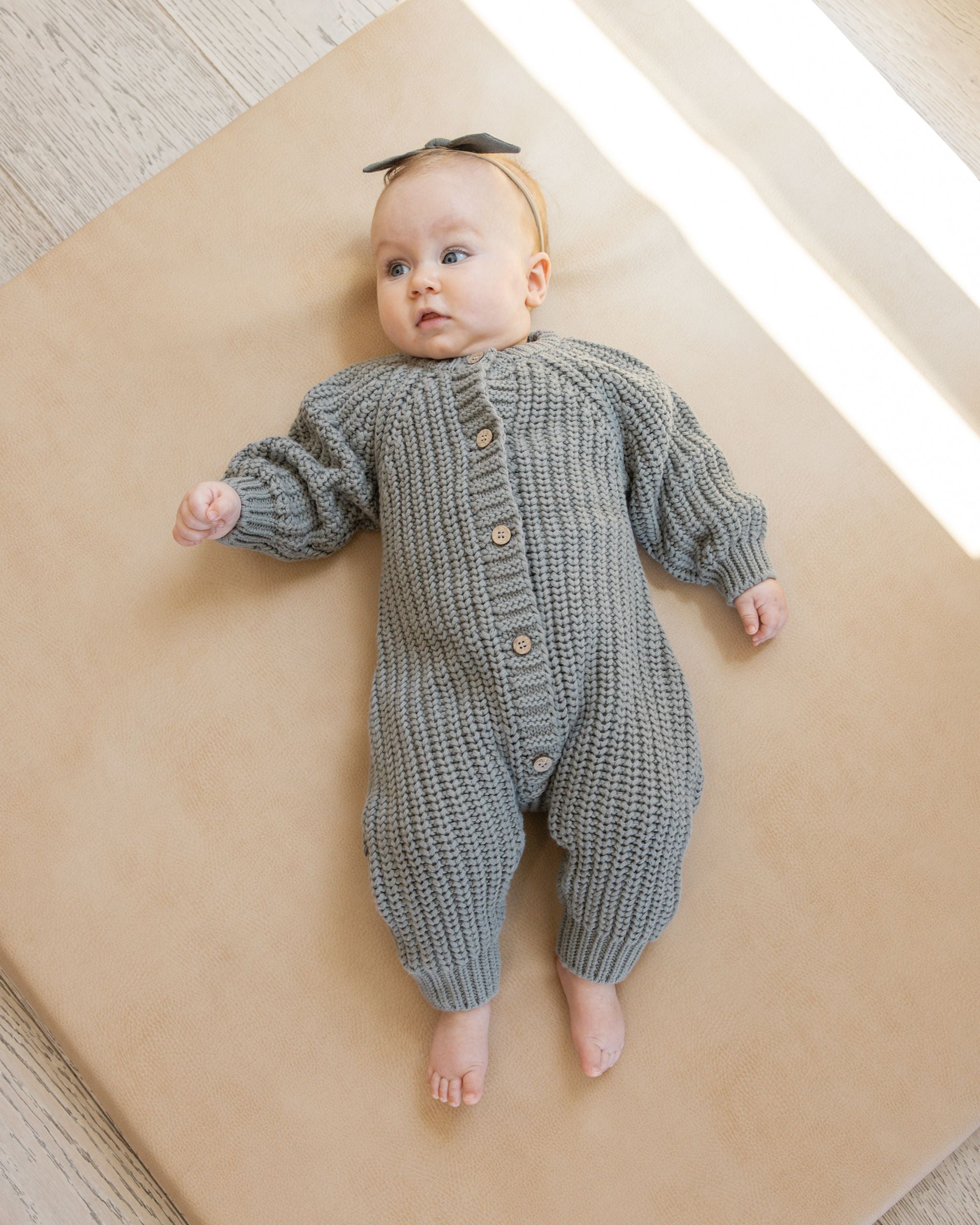 Chunky Knit Jumpsuit made of soft and chunky sweater knit, that is sure to keep you little one cute and cozy this fall. Featuring coconut buttons down the front and a relaxed fit.