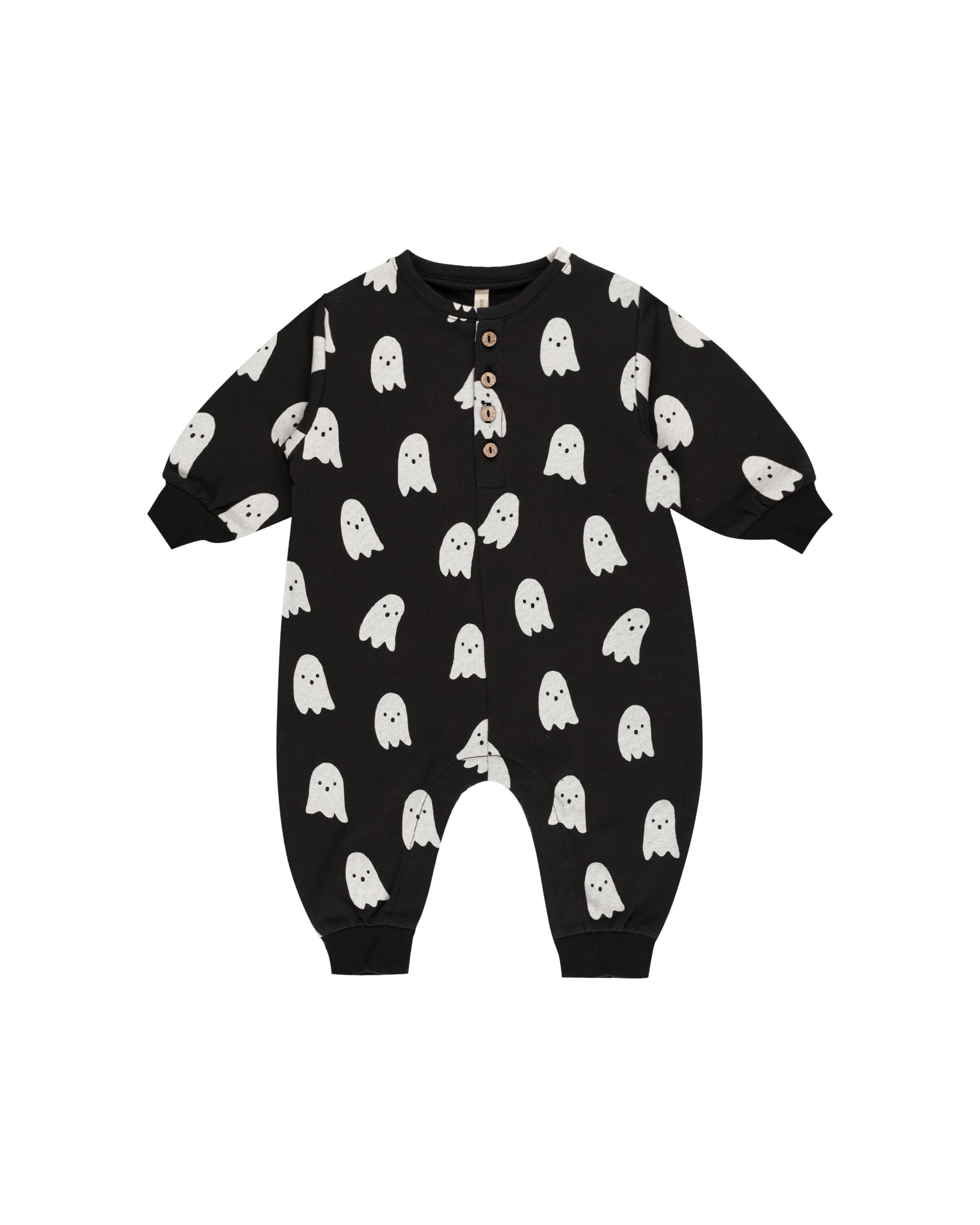 Stay cozy and stylish in our Relaxed Fleece Jumpsuit featuring a playful ghost pattern for Halloween. Made with 96% organic cotton and 4% elastane, it's perfect for a comfortable, sustainable and unisex fit.