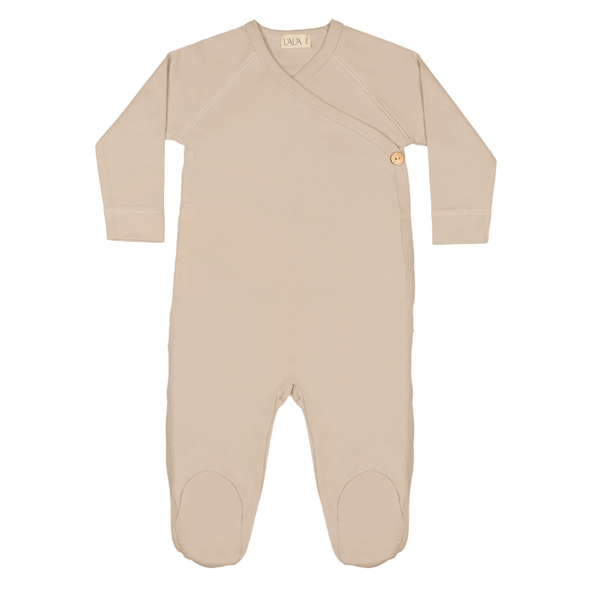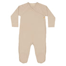 The kimono footie with feet & detailed wooden button is designed with snap buttons from top to bottom for easy dressing and diaper changes. It also has fold over hand mittens to prevent scratching for sizes: NB & 1-3M. The perfect outfit for both day and night.