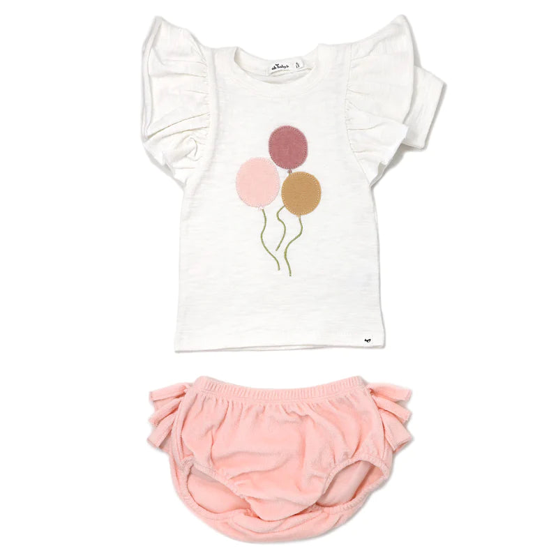 Butterfly sleeve tee in a cotton slub material with matching ruffle tushie bottom in terry cotton. Terry cotton balloons applique on tee. Designed in Minnesota. Available in infant sizes.