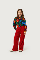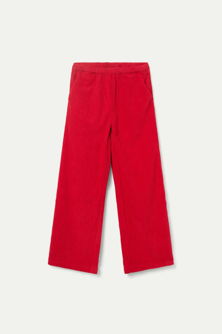 Girl's red corduroy pants. With elastic waist and straight leg. Side pockets. The model is 134 cm tall and wears size 8.