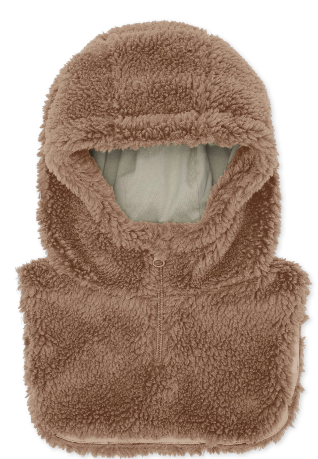 Neck warmer and hood made in soft teddy polyester with cotton lining. Designed with a zipper on the front.