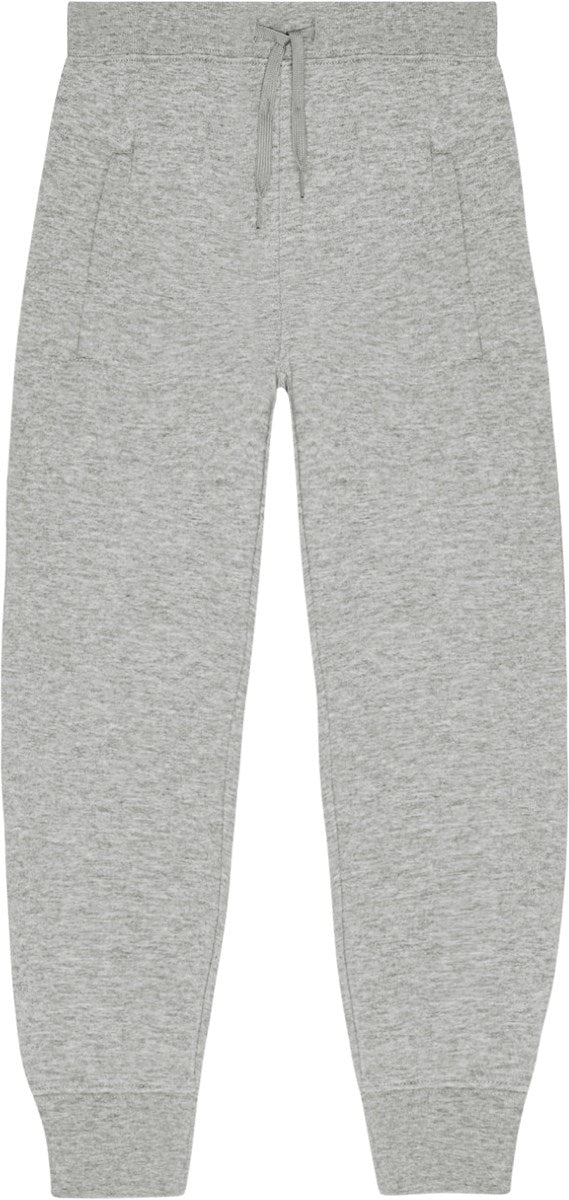 Grey melange sweatpants in organic cotton with drawstring and ribbed waistband, ribbed cuffs at the ankles, pockets with hidden zippers on the sides, and a back pocket. The trousers have a snug fit and a brushed inner face, making them soft and warm to wear.