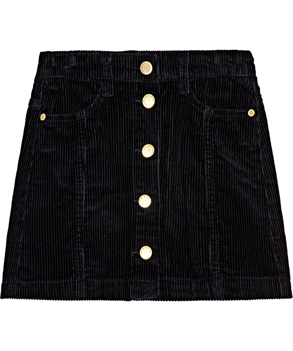 Black velvet skirt with gold-coloured buttons for fastening. The skirt reaches mid-thigh and has a waist with belt loops and front pockets. The beautiful cut includes detailed stitching that runs from the pockets down.