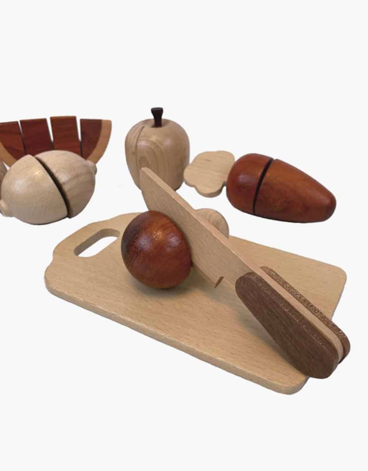 3 wooden vegetables in pieces (cucumber, carrot, onion)