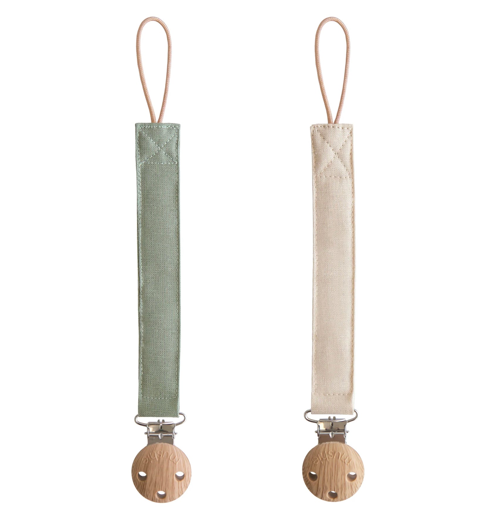 Keep soothing favorites near little hands with our two-pack linen pacifier clip. With an interior water resistant coating, this material can easily withstand daily use and messy moments. Its fabric is soft to the touch while the faux wood silicone clasp holds secure to keep pacifiers in reach and off the floor. The loop design is compatible with most pacifiers as the clip offers durability and long-lasting features to families on-the-go.