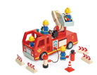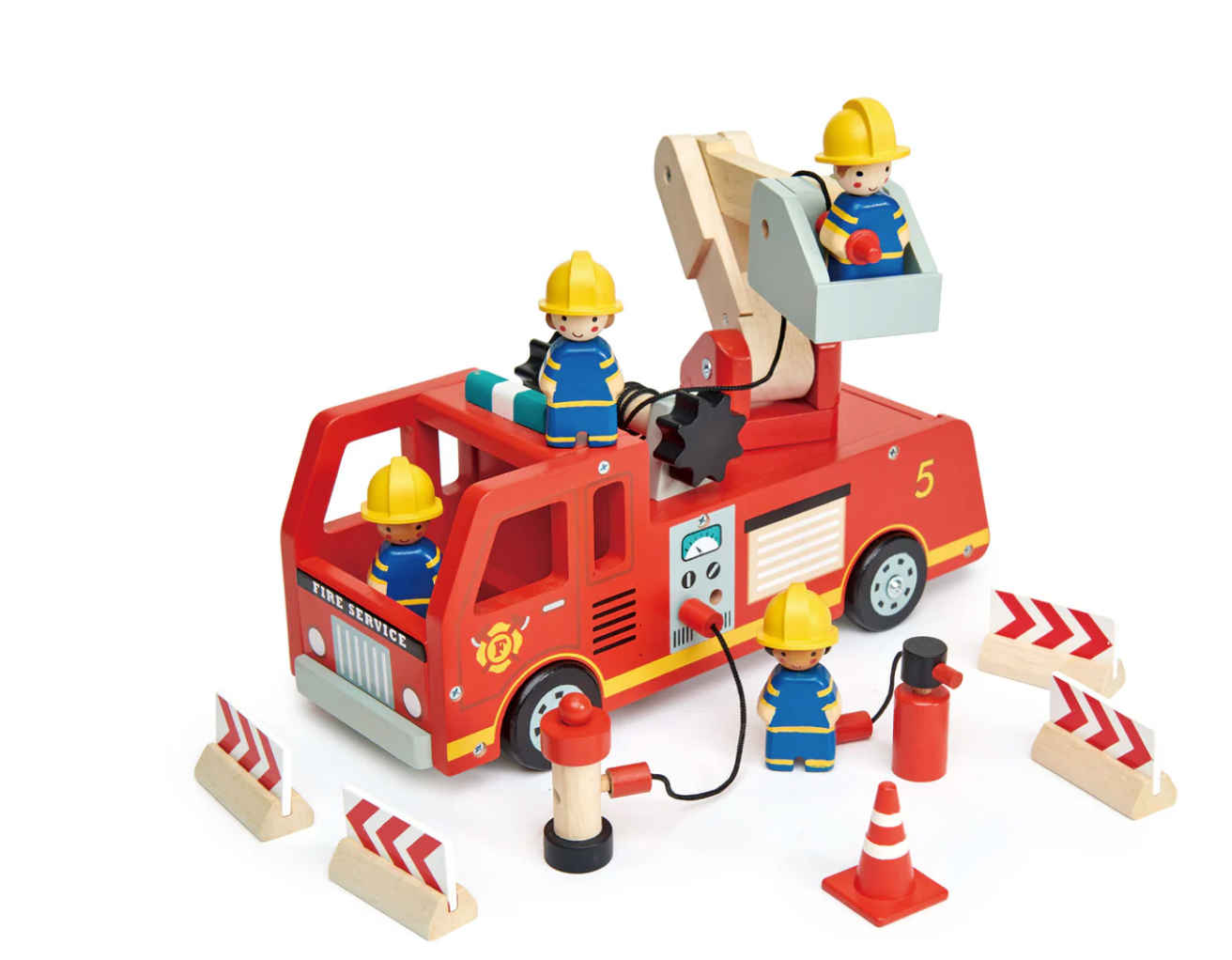 This bright fire engine has an unrolling hose and a natural wood extending arm to take the 4 firefighters to dizzying heights to fight fires or rescue a kitten!
