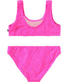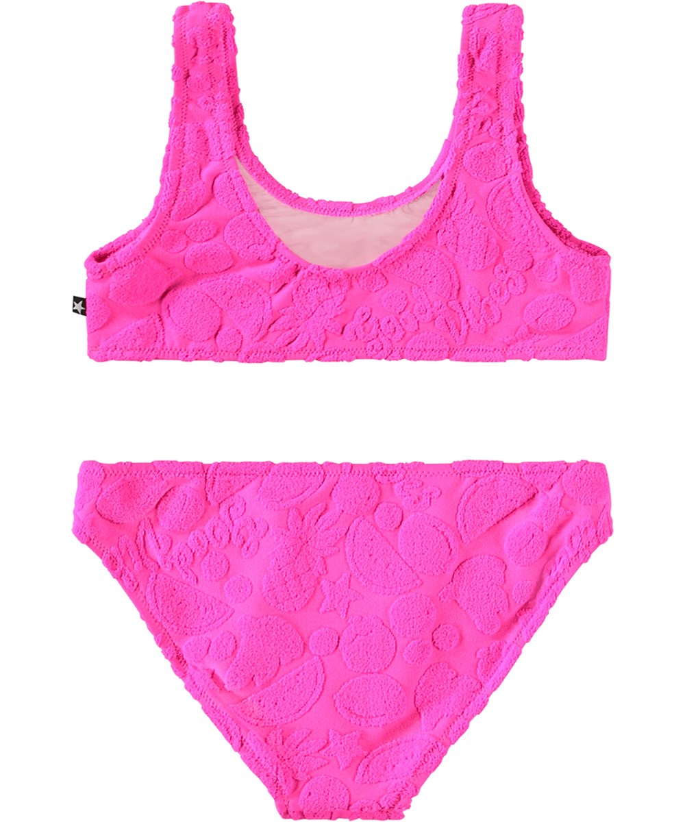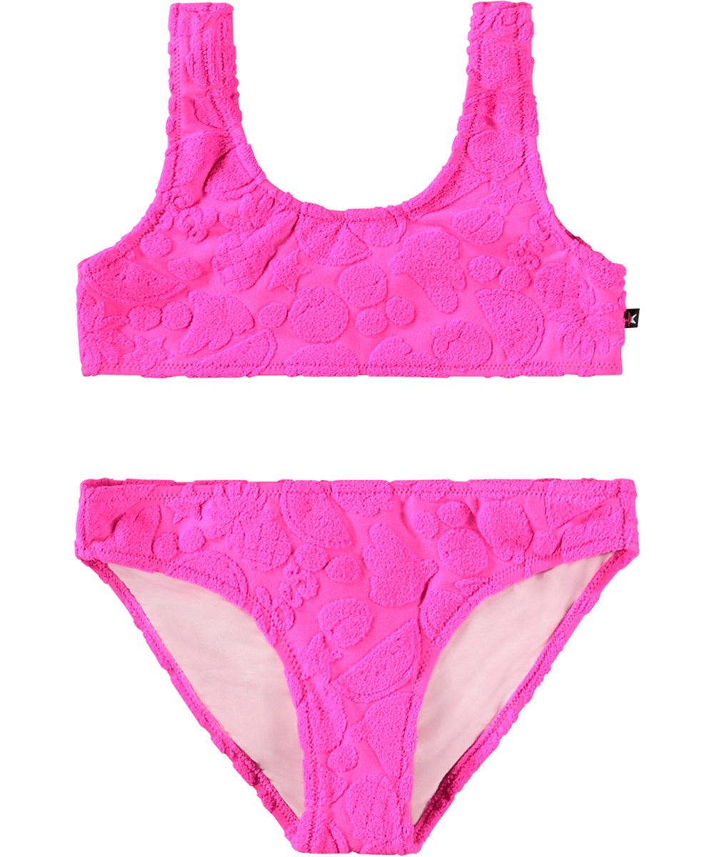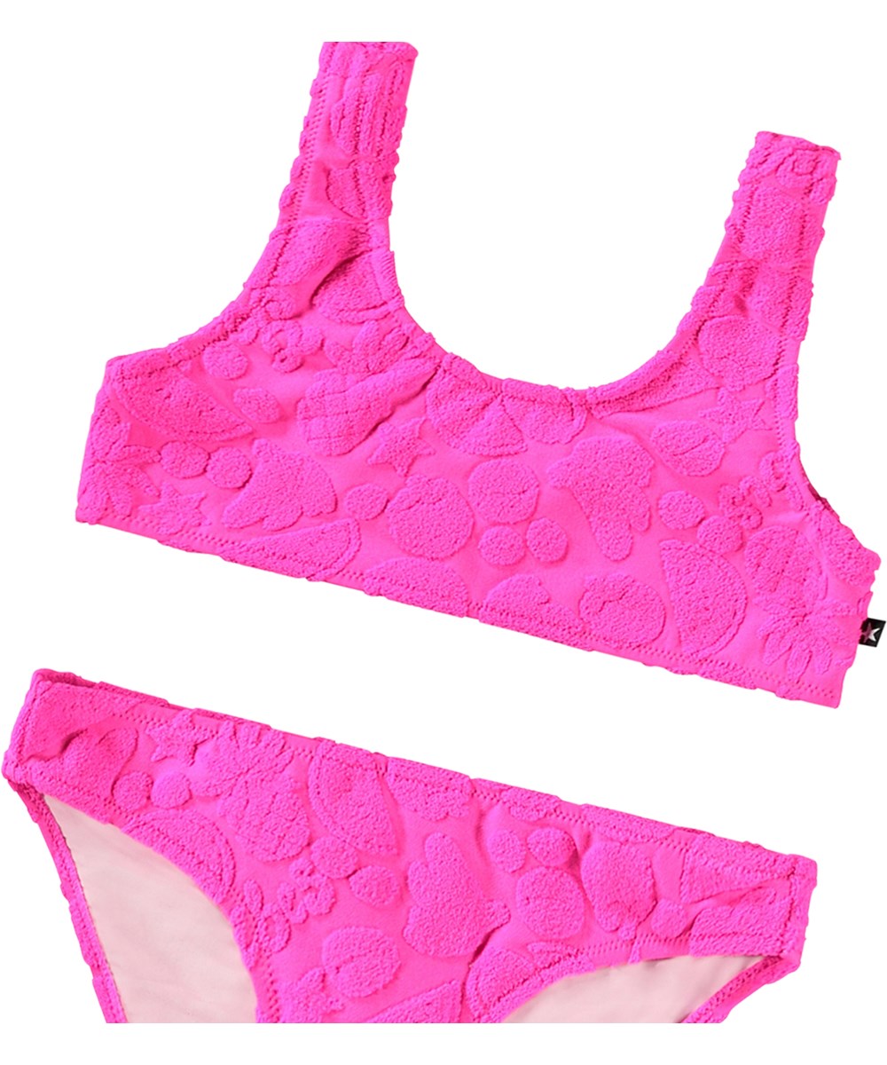 Stretchable pink bikini with a pattern of exotic fruits in recycled polyester and UV protection 50+.The bikini has a wide top, wide straps, deep back, and is fully lined.The bottom has an elastic waistband, a regular fit, and is also fully lined. The product is CE-marked and tested according to standard