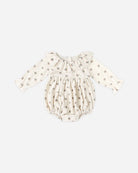Long sleeve velour romper with gathered waist, ruffle collar, and lace trim details at neckline and cuffs. Snap closures along the inseam for easy changing.