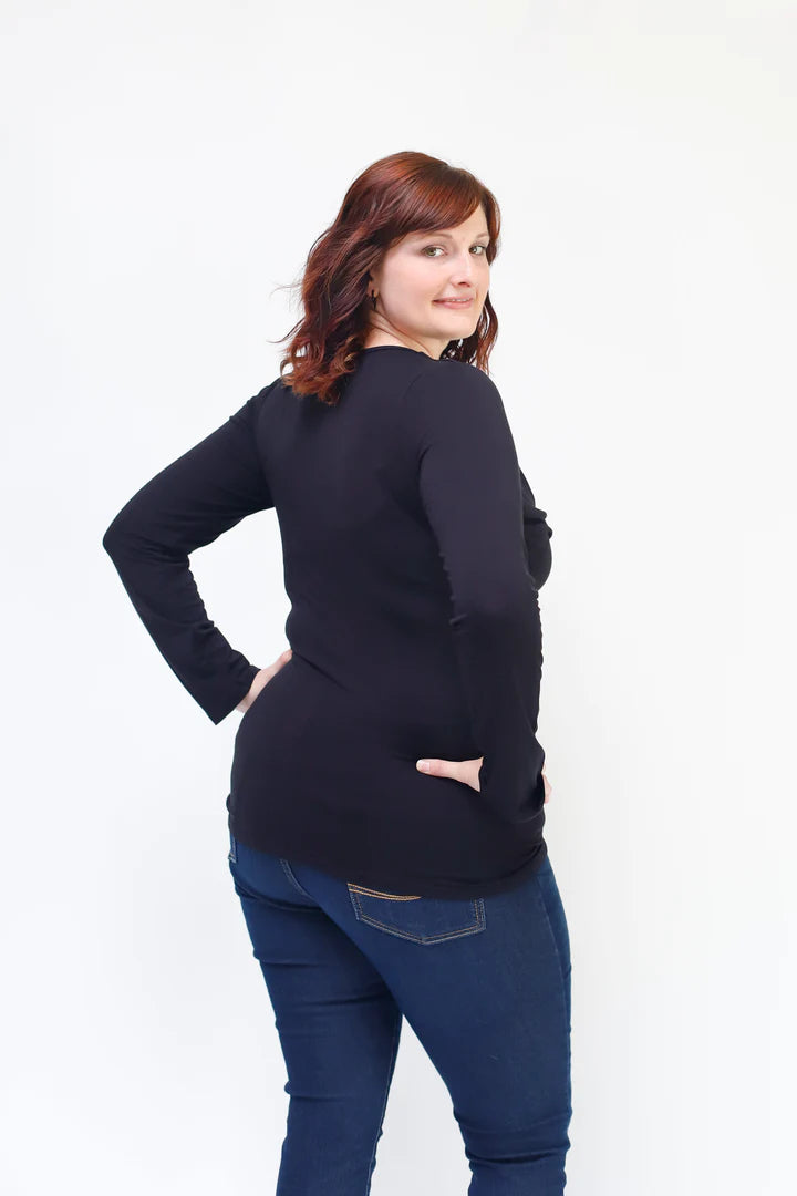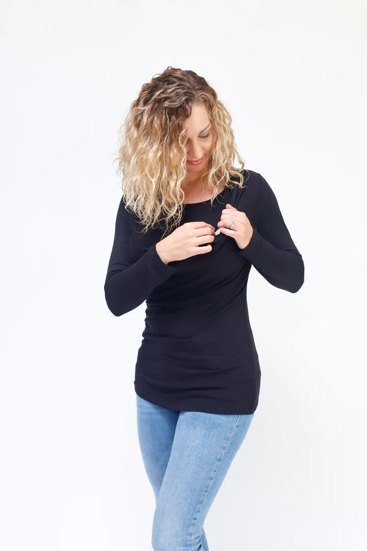 Falling gently along the chest, our cowl neck nursing top provides a unique breastfeeding approach with easy side access. The cowl neck design ensures you do not pull down and stretch the fabric out of shape. Instead, the lower, structured neck line allows you to pull to the side which makes a more comfortable breastfeeding experience for mom and baby.